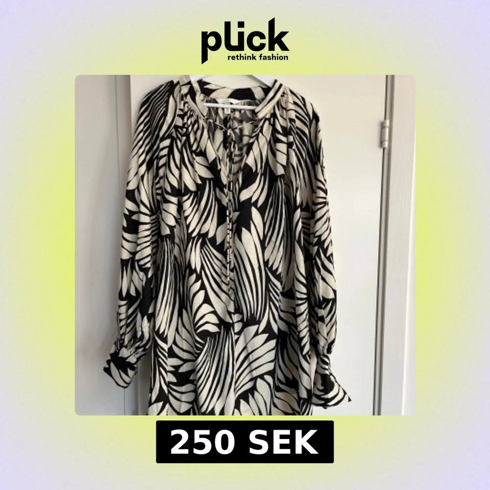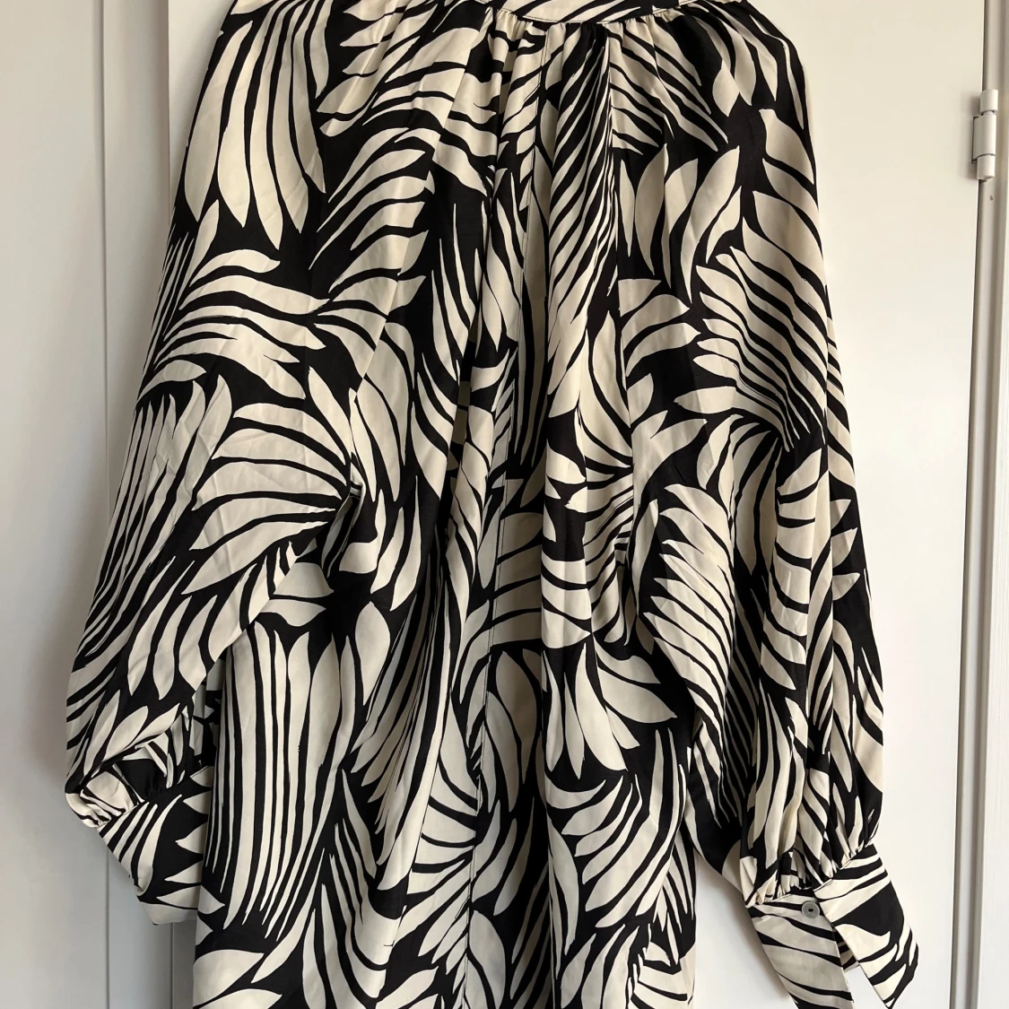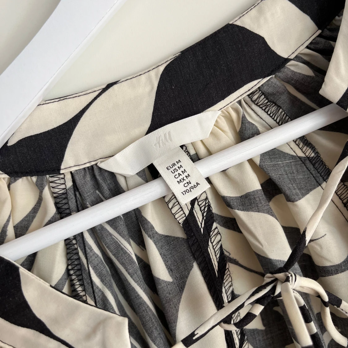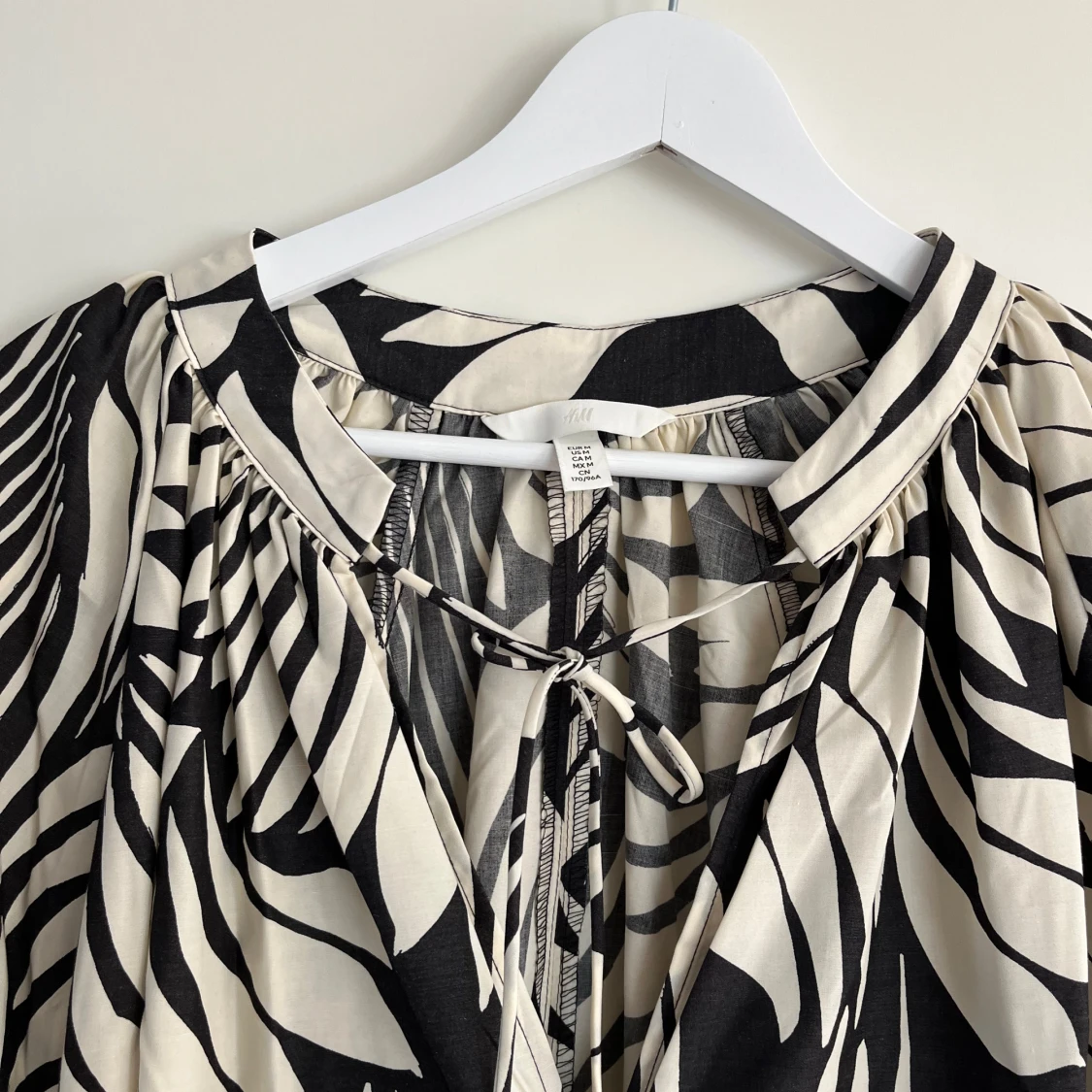 Snygg svartvit klänning från H&M med grafiskt mönster, långa ärmar och knytning vid halsen. Luftig modell i mjukt material, perfekt för dig som gillar statement-plagg med coola detaljer.