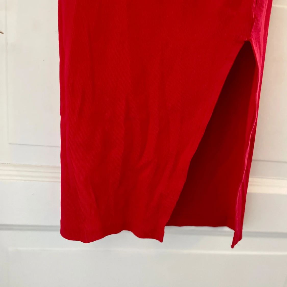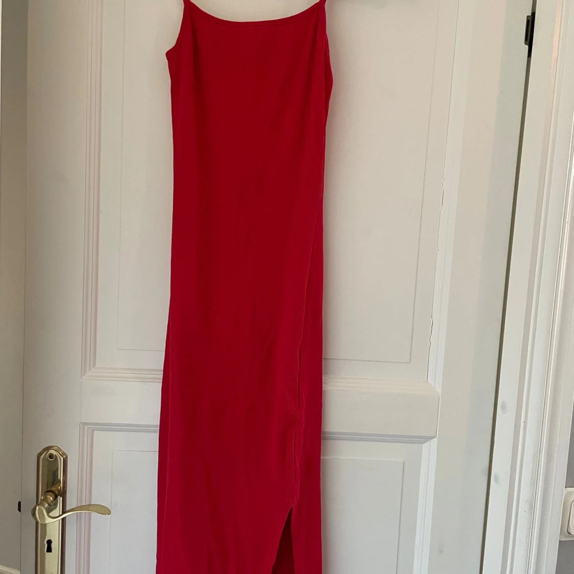 Säljer en röd långklänning med smala axelband och slits på sidan. I mycket bra skick!