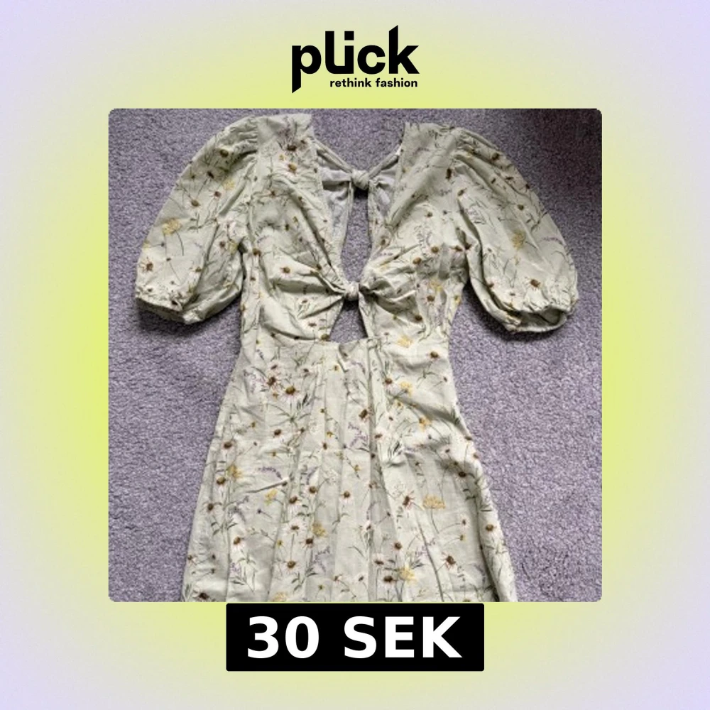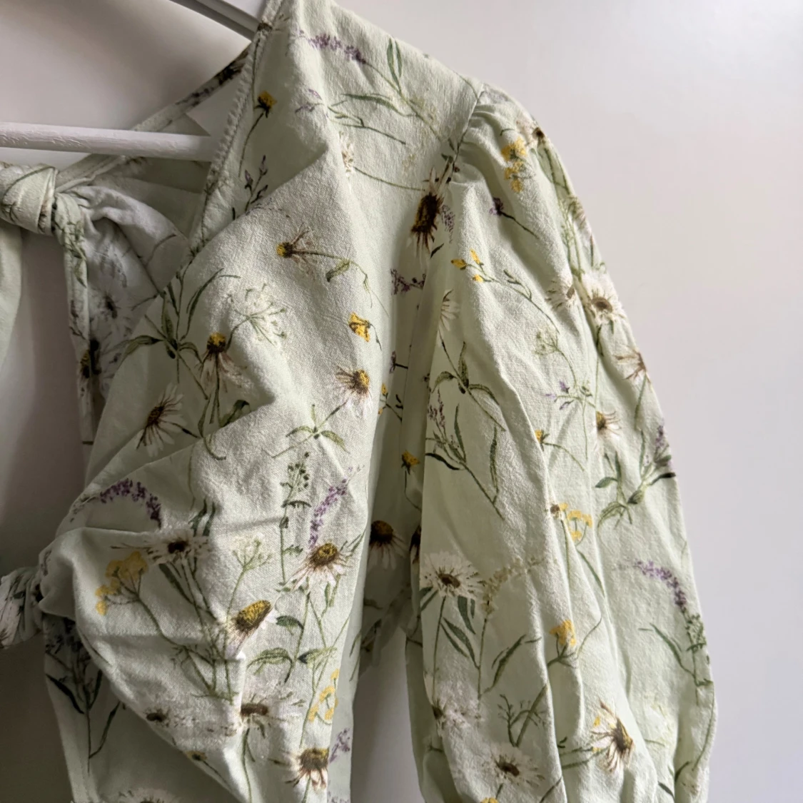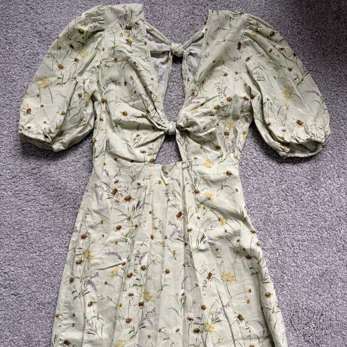 🤍Superfin ljusgrön kortklänning med blommigt mönster, puffärmar och knytning framtill. Klänningen har cut-out-detaljer och v-ringning 🤍