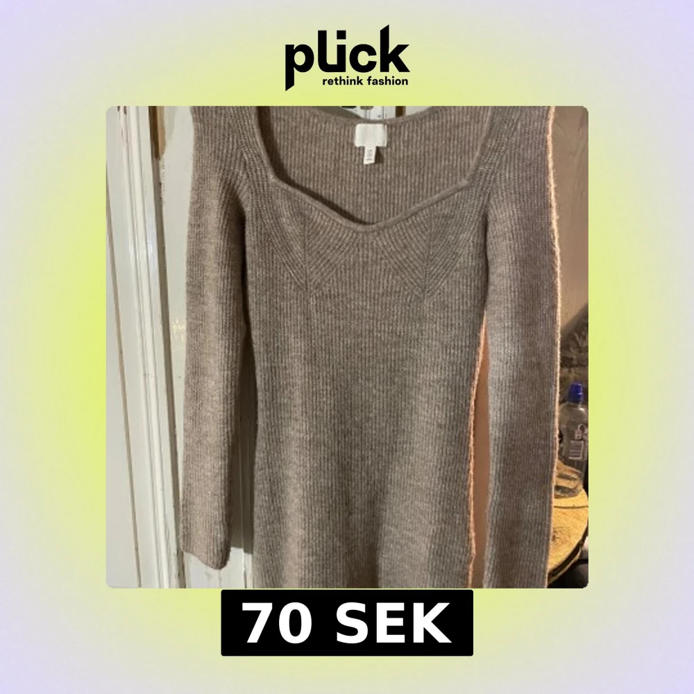 Säljer en mysig beige stickad Klänning från H&M. Klänningen har en v-ringad design och långa ärmar, perfekt för kyligare dagar. Den ribbade strukturen ger en stilren look. Passar bra till både strumpbyxor och kjol.
