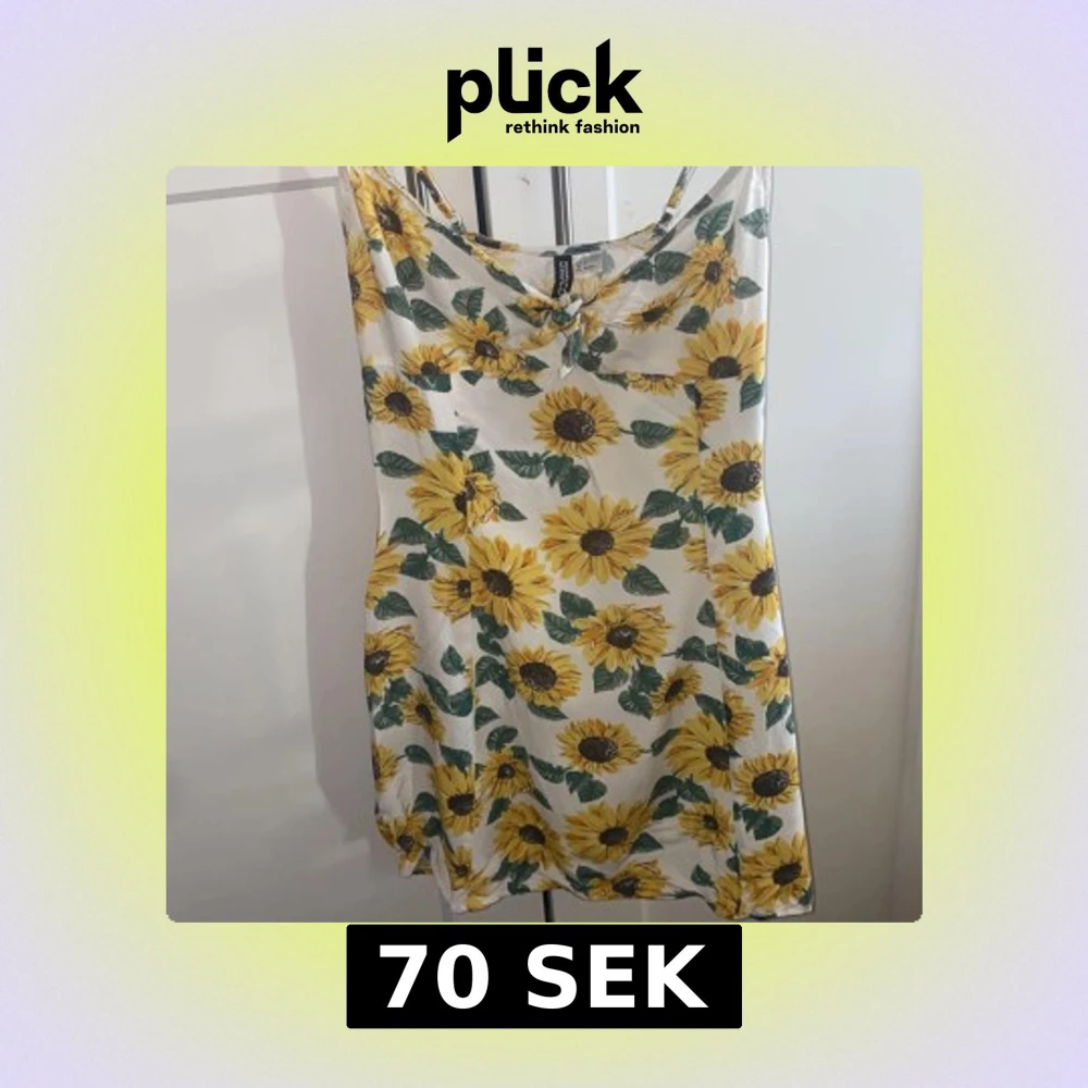 Söt sommarklänning från H&M med solrosmönster. Klänningen är ärmlös och har en avslappnad passform, perfekt för varma dagar. Den är gjord i ett lätt och luftigt material med en vit bas och gula blommor. Använd 1/2 gånger.