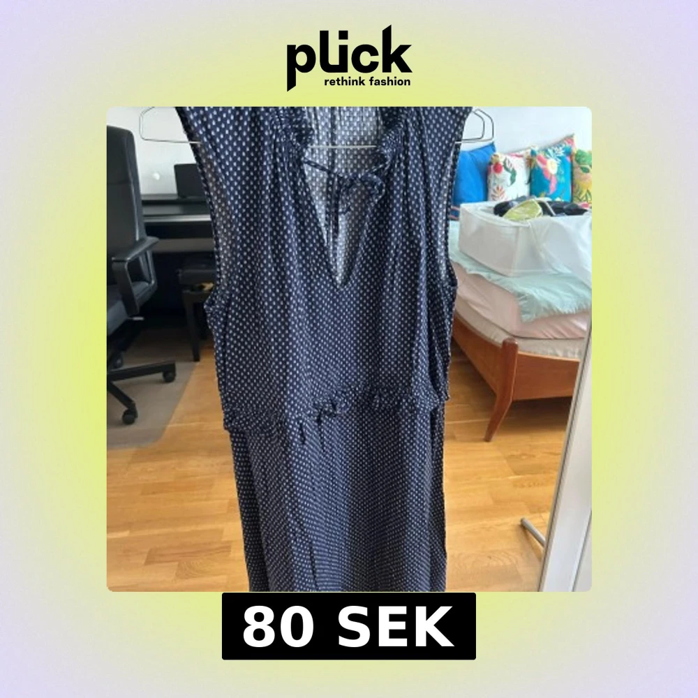 Supersöt mörkblå klänning från H&M med vitt prickigt mönster, ärmlös design och knytning vid halsen. Klänningen har en avslappnad passform och lätt rynk vid midjan. Perfekt för varma dagar och enkel att styla med sneakers eller sandaler.