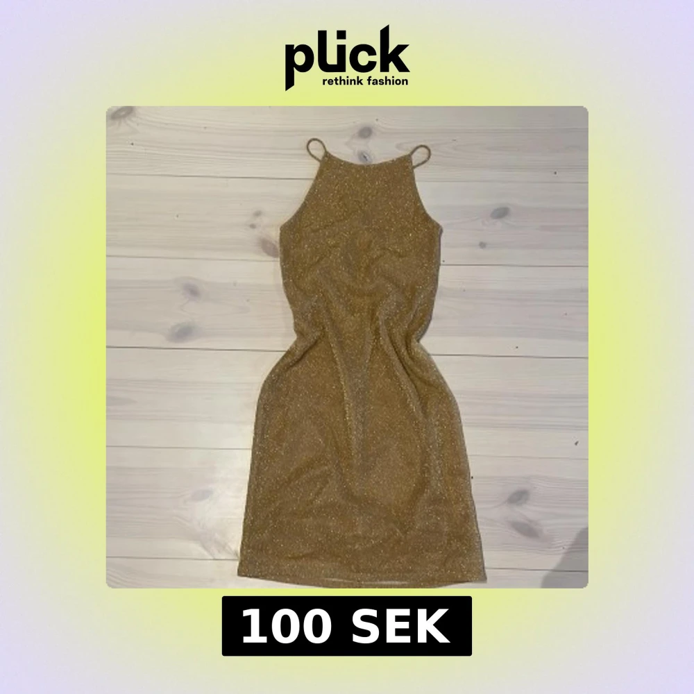 Säljer en glittrig guldig klänning med smala axelband och öppen rygg. Klänningen har en rak passform och är kort i modellen. Perfekt för dig som vill sticka ut med lite extra glitter.