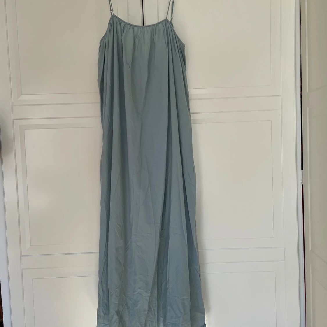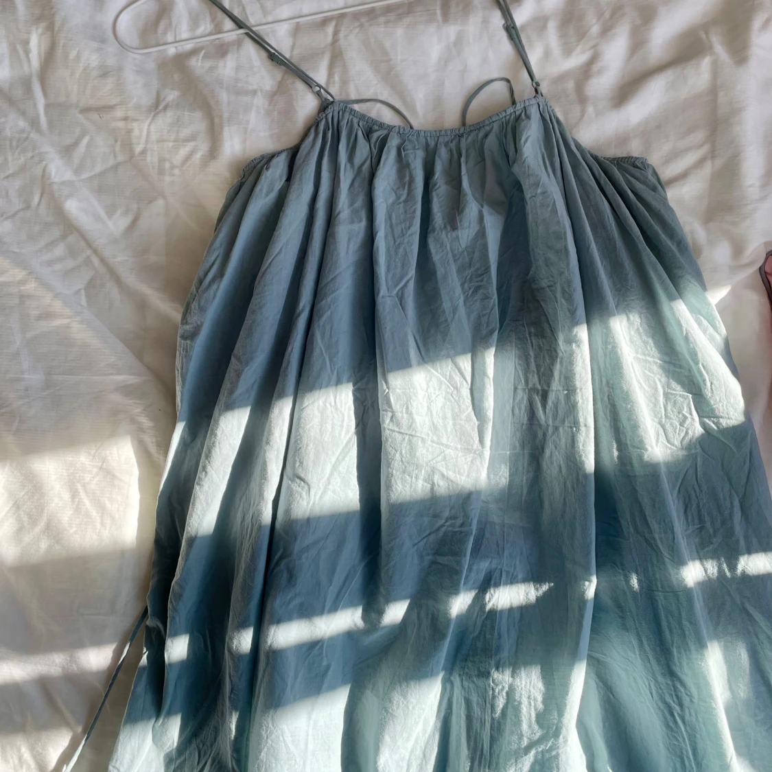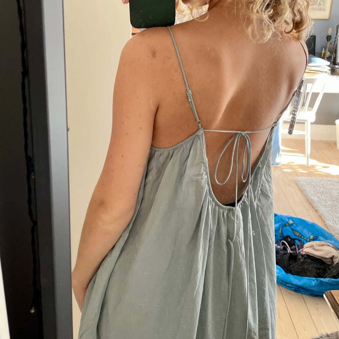Luftig och flowy ljusblå långklänning med tunna axelband och öppen rygg med knyt. Klänningen har en avslappnad passform och är tillverkad i ett mjukt bomullsliknande material. Perfekt för varma dagar på semestern eller på stranden. Nästan oanvänd