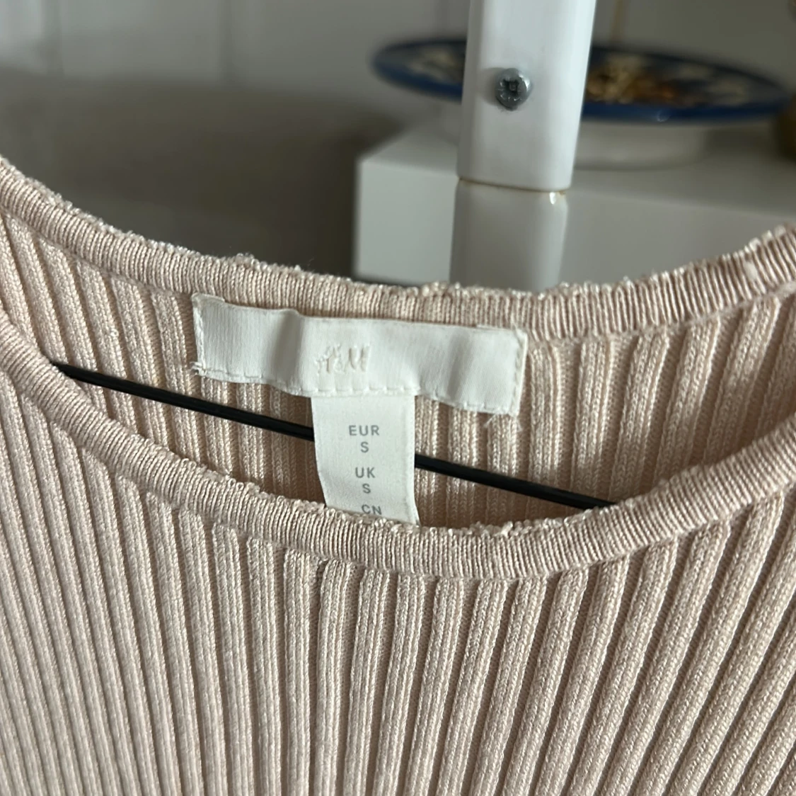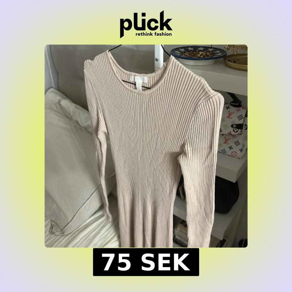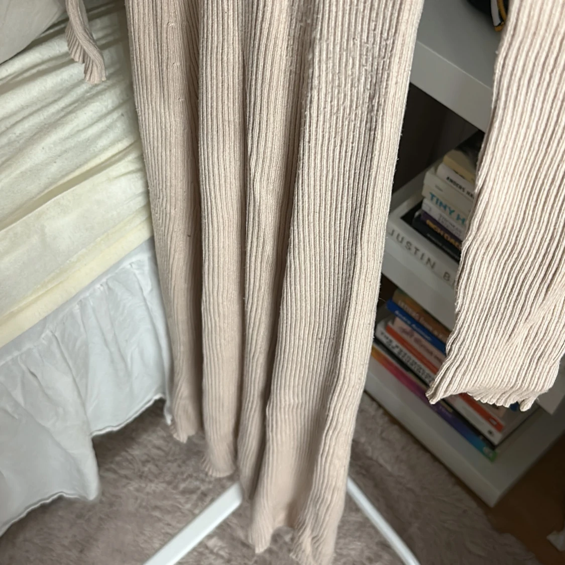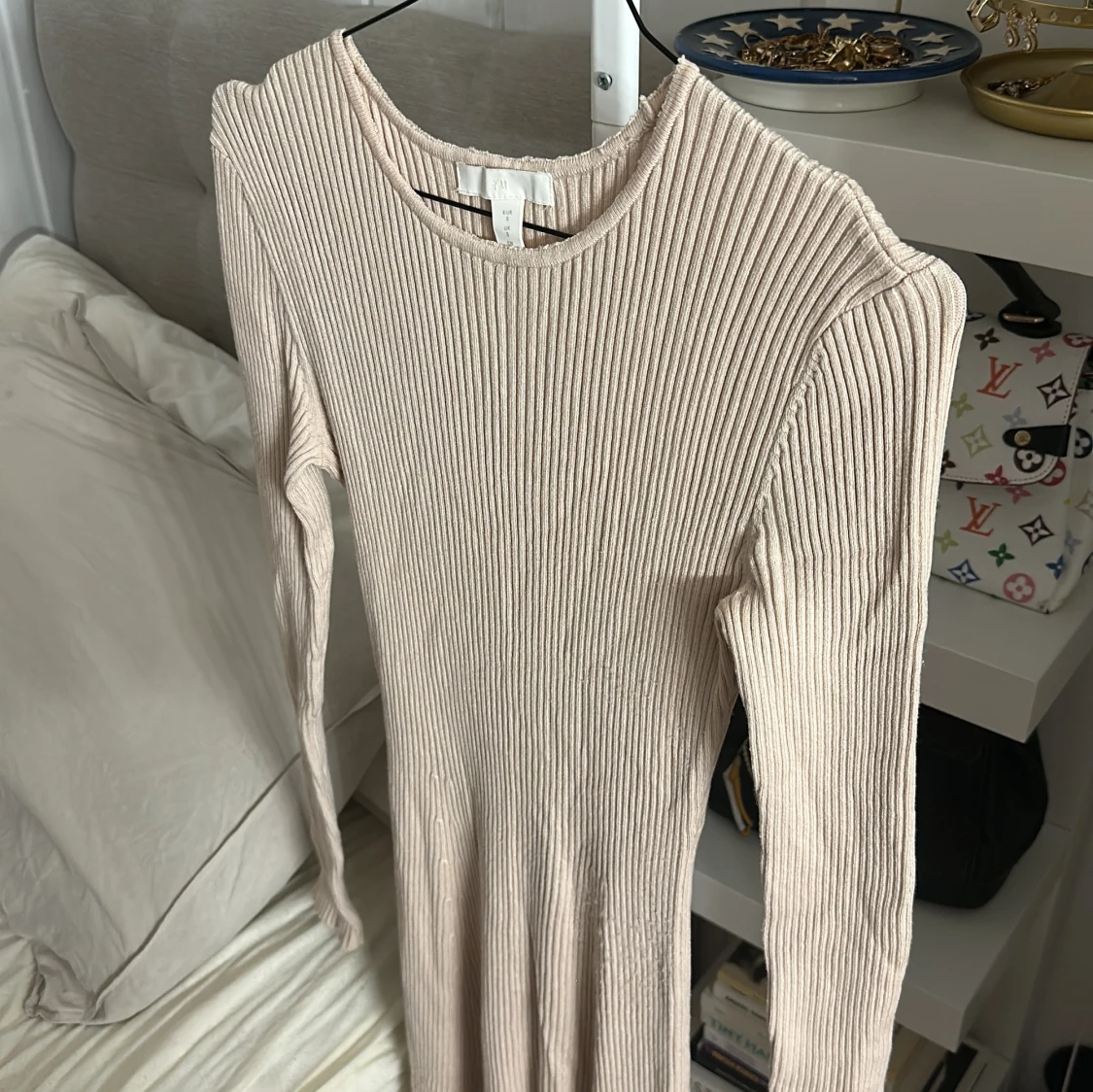 Säljer en beige långklänning från H&M i storlek S. Klänningen är ribbad med långärmade och har en rund halsringning. Materialet är mjukt och stretchigt, vilket gör den superbekväm. Perfekt för dig som gillar enkel och stilren design.