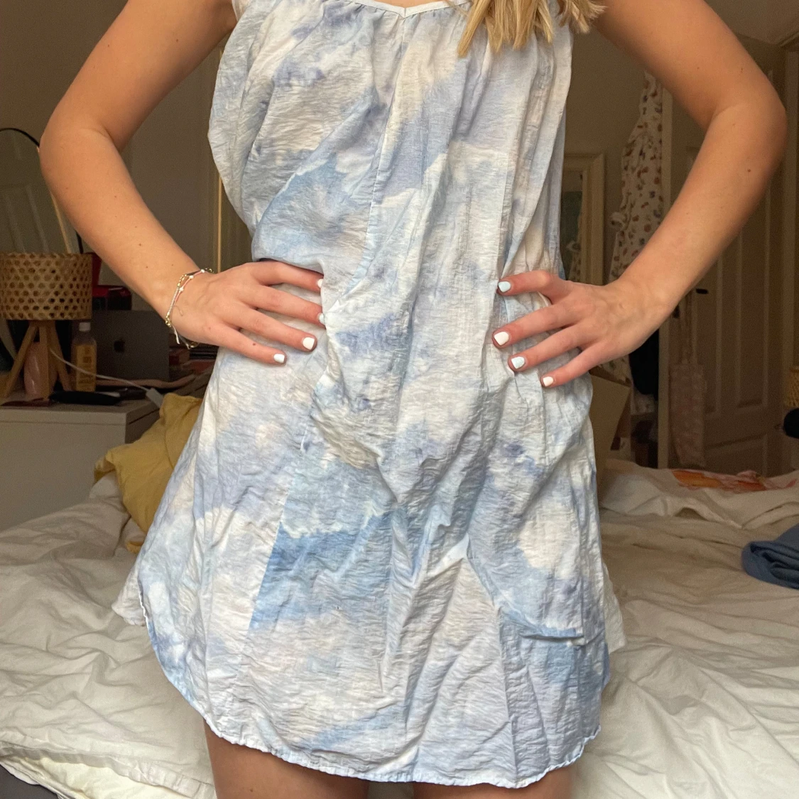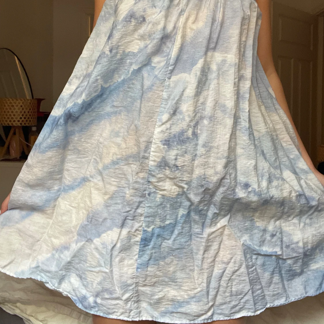 Säljer en luftig och flowy kortklänning med tunna axelband och vackert batikmönster i ljusblått och vitt. Klänningen har en lös passform och är perfekt för varma dagar. Materialet känns mjukt och svalt mot huden. Klänningen går lätt att stryka.