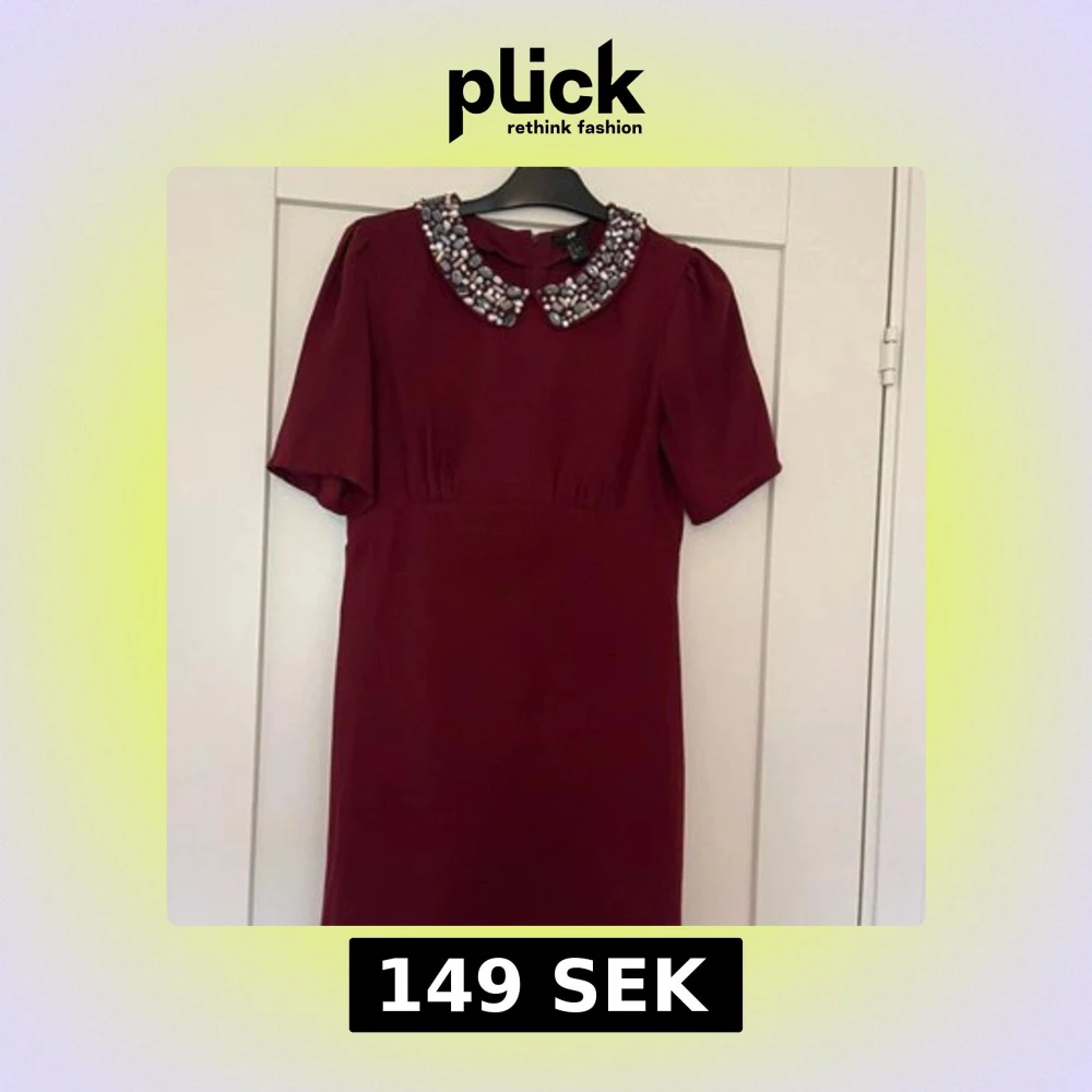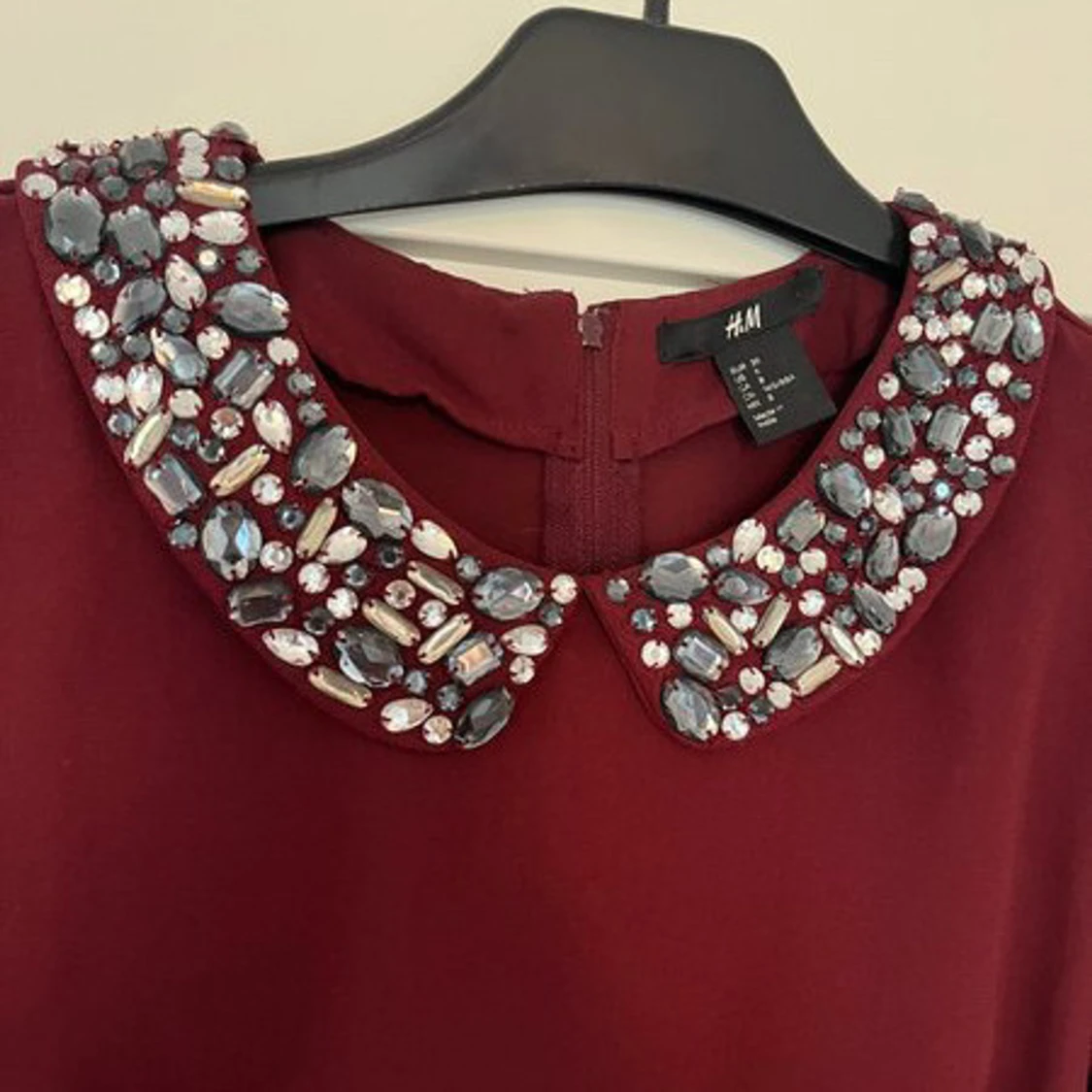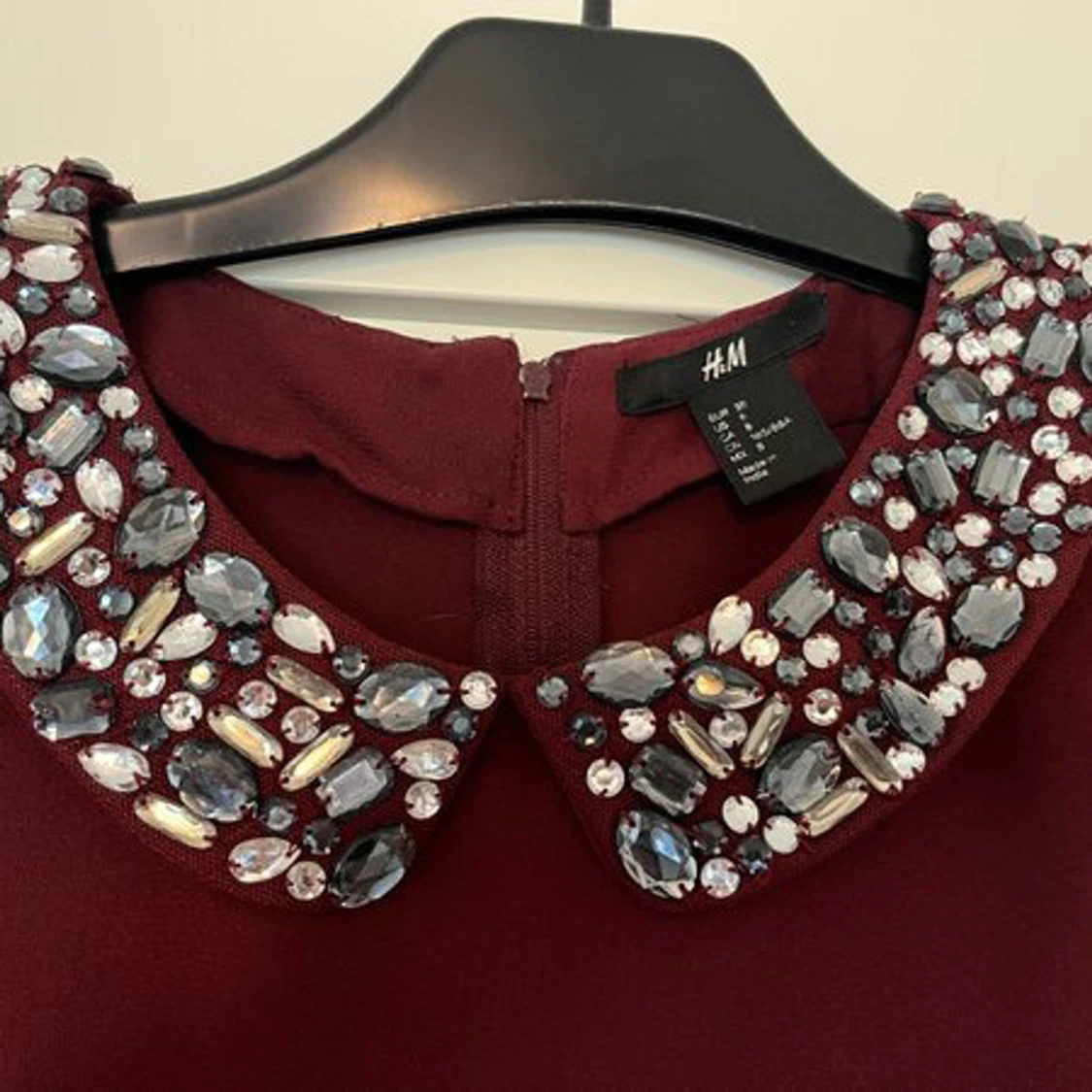 Supersnygg vinröd kortklänning från H&M med korta ärmar och en statementkrage täckt av glittrande pärlor och stenar. Klänningen har en klassisk rak passform och dragkedja bak. Perfekt för dig som vill sticka ut med en cool detalj.