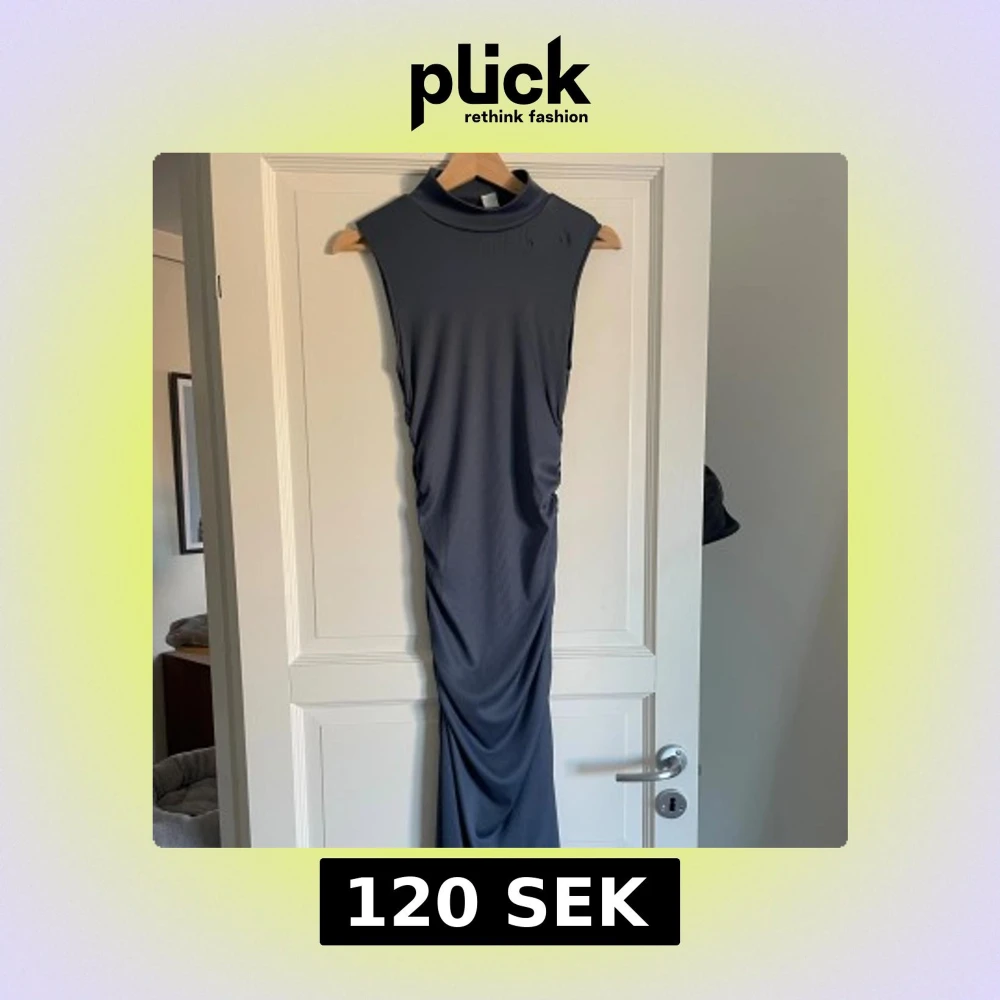 Säljer en lång, mörkblå ärmlös klänning från H&M i ribbad polyester. Klänningen har hög hals och en tight passform som framhäver siluetten.