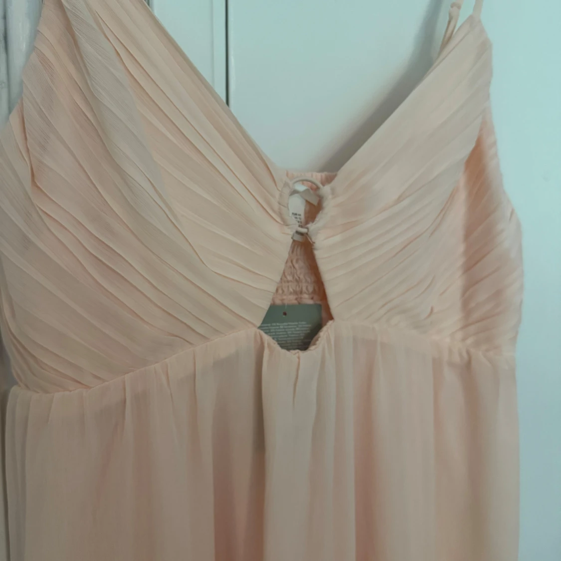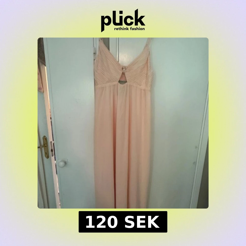 Superfin ljusrosa långklänning med smala axelband och v-ringad topp. Klänningen har ett snyggt veckat liv, liten cut-out framtill och faller mjukt i ett tunt, flowy tyg. Perfekt för sommarens speciella tillfällen!