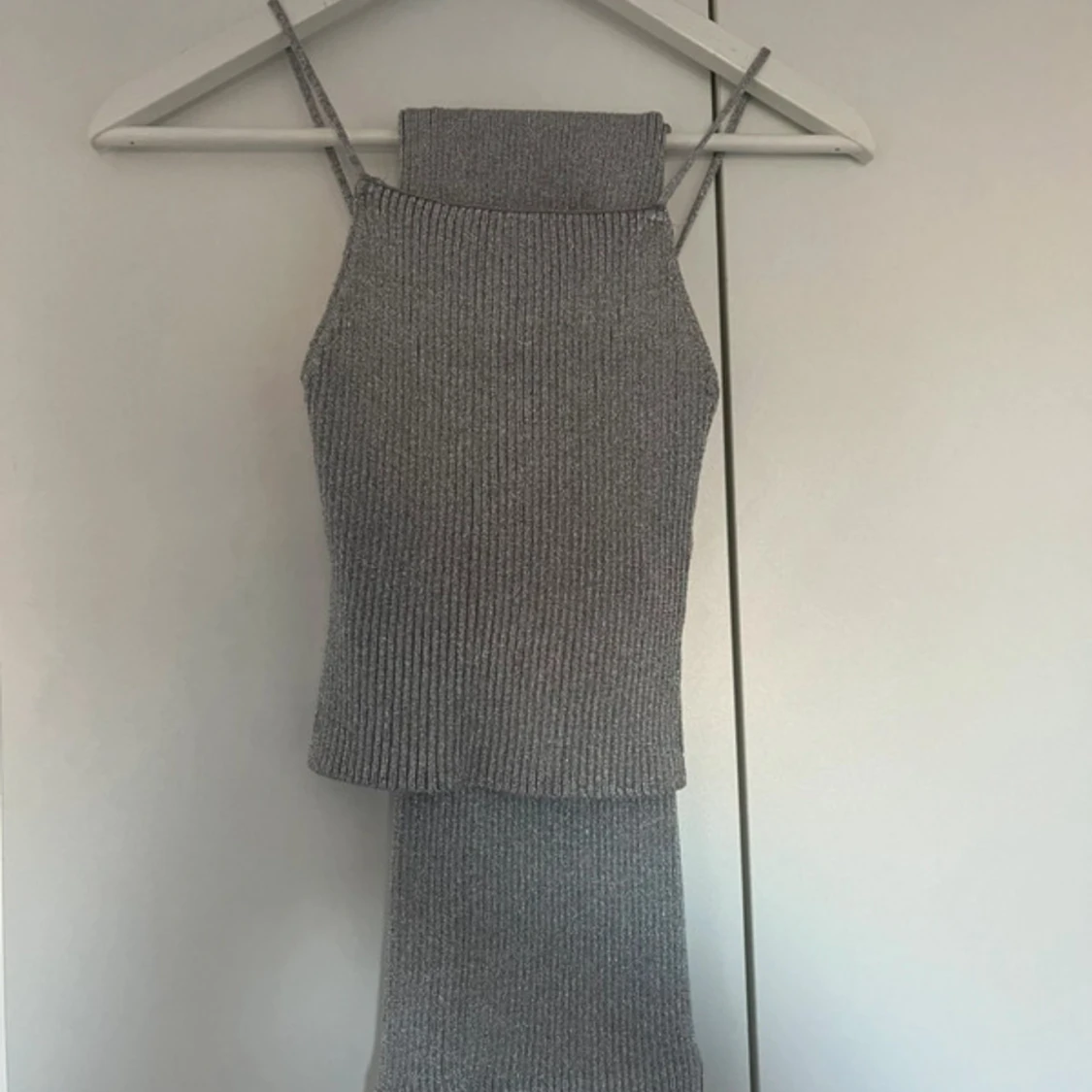 Snygg grå stickad klänning med ribbad struktur och smala axelband. Klänningen är ärmlös och har en rak, kroppsnära passform som ger en stilren look. Perfekt för dig som gillar minimalistisk stil och vill ha något bekvämt men trendigt.