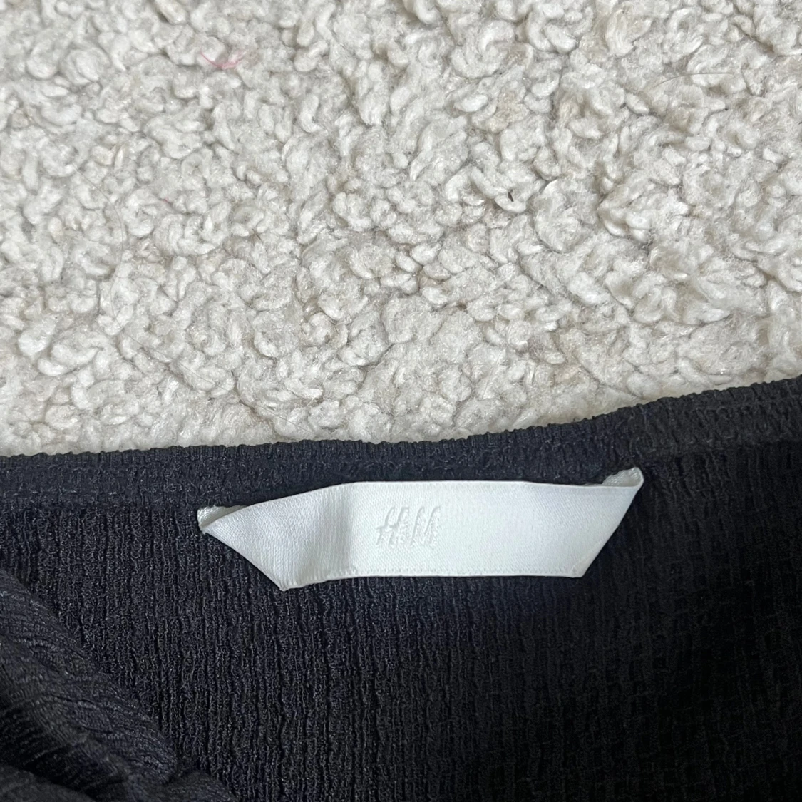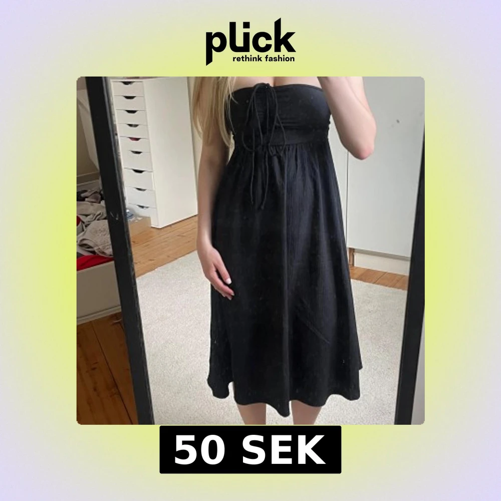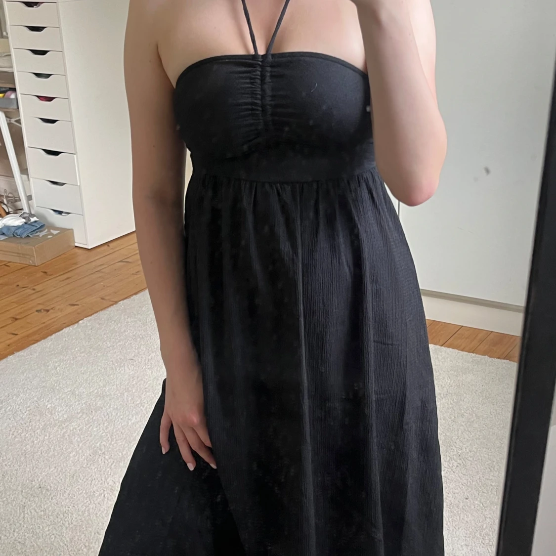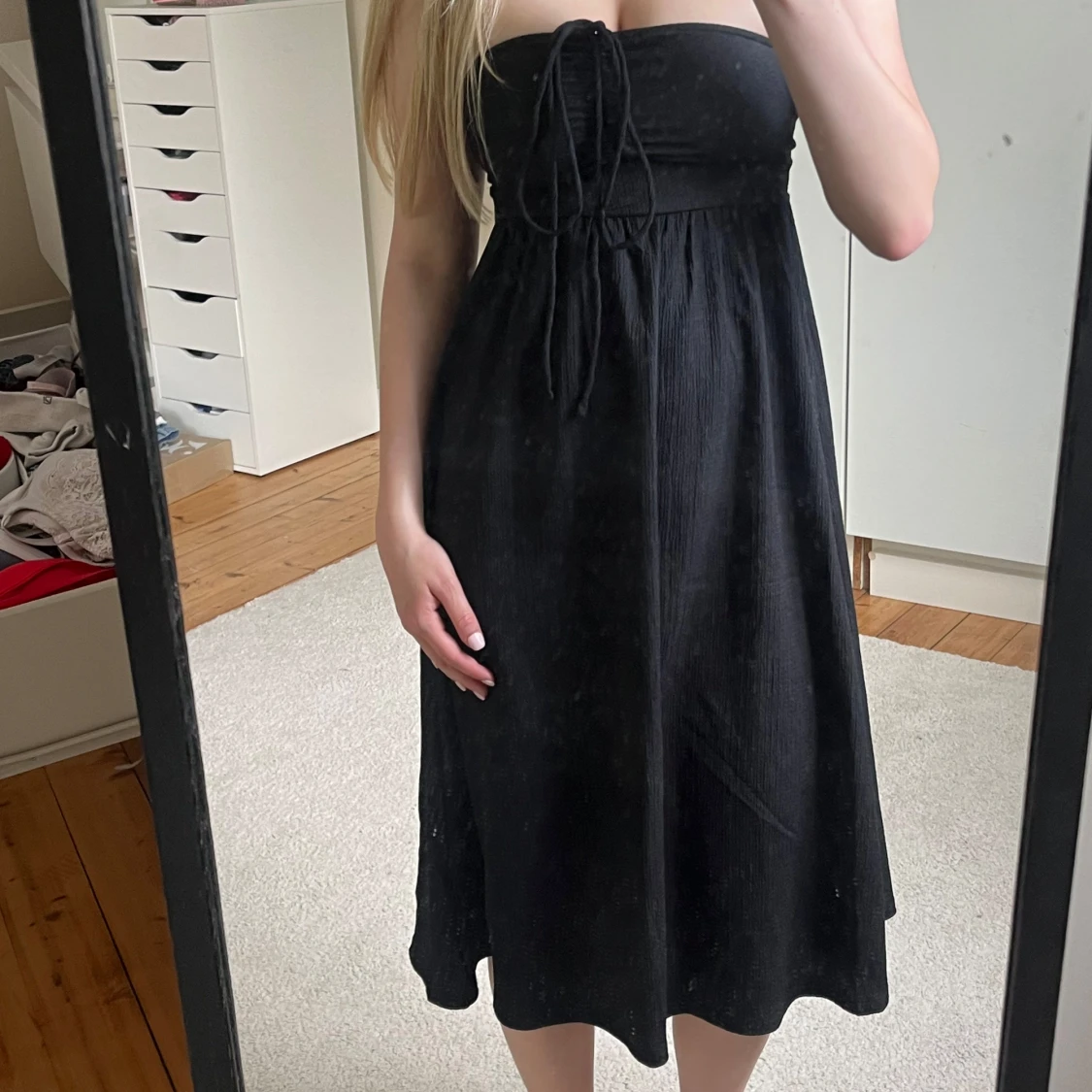 Svart axelbandslös klänning från H&M med smockad överdel och knytband framtill. Klänningen har en lätt utställd kjol i mjukt tyg och går till knäna. Perfekt för sommarens varma dagar och enkel att styla med accessoarer. Perfekt att ha som strandklännig❤️