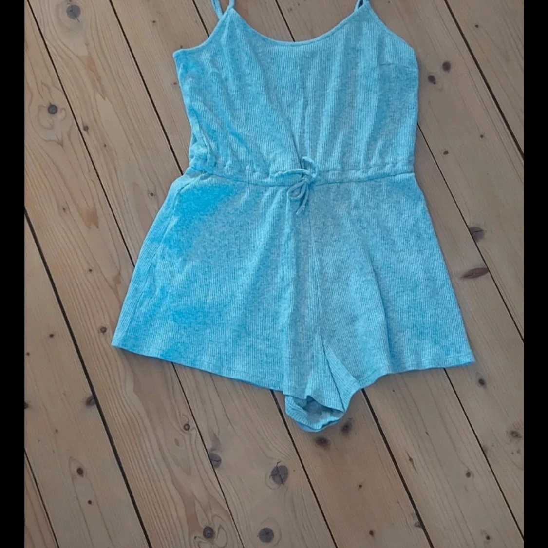 Säljer en söt ljusgrå ribbad jumpsuit med smala axelband och knytning i midjan. Perfekt för varma sommardagar. Den har en avslappnad passform och är superbekväm att bära. Passar perfekt för en dag på stranden eller en avslappnad utflykt. 🌞
