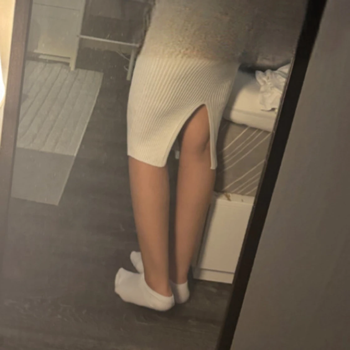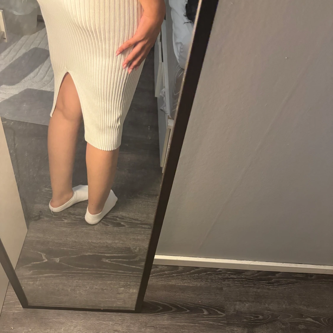 Supersnygg vit ribbad medellång klänning med v-ringning och smala axelband. Klänningen är figurnära och har en slits baktill som ger en extra touch. Perfekt för dig som gillar en enkel men stilren look.