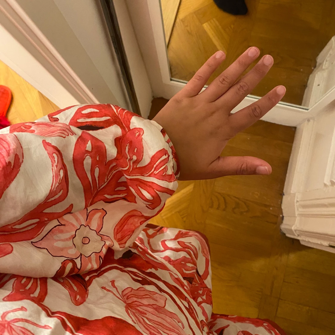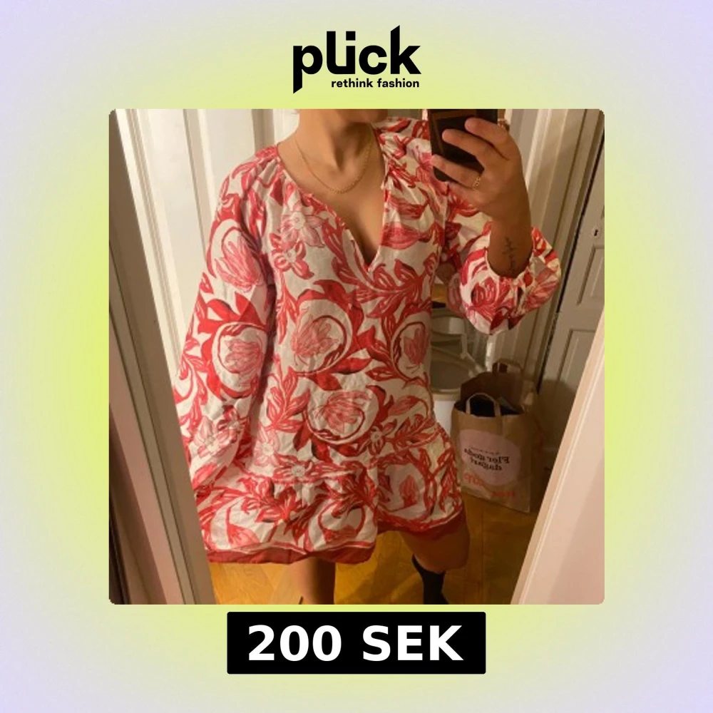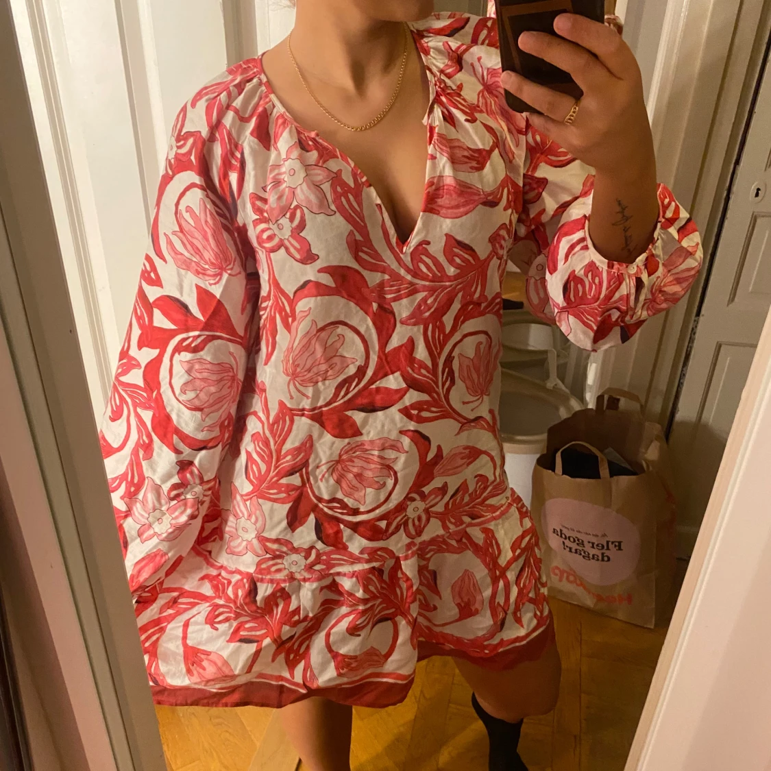 Säljer en söt klänning med rosa och vitt blommönster. Den har en v-ringad hals och långa ärmar. Perfekt för en somrig look! Aldrig använts!