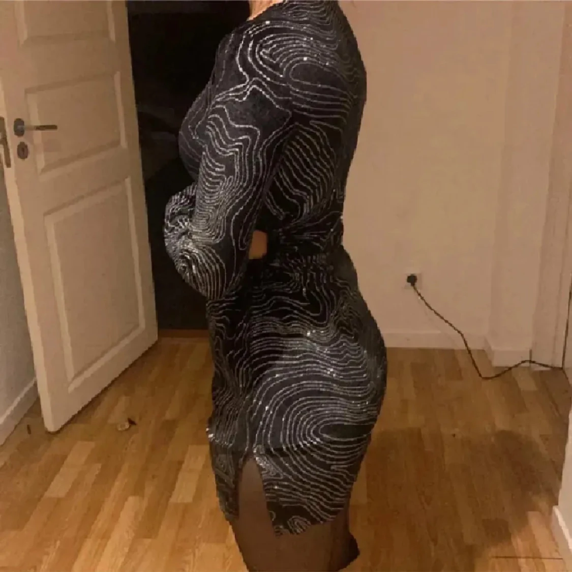 Svart kort klänning med glittrigt mönster i silver, långärmad och med cool cut out-detalj i midjan. Klänningen har en tight passform och slits på sidan, perfekt för dig som vill sticka ut. Materialet är stretchigt och skimrar snyggt i ljuset.