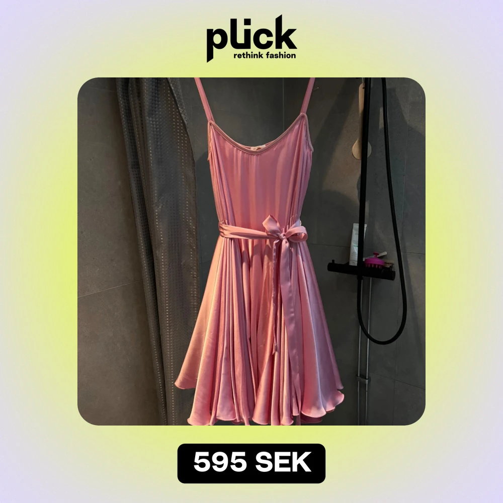 Superfin rosa klänning i satin med ett knytband i midjan. Axelband och en härlig, fladdrig kjol som passar perfekt för sommarens fester. Klänningen är i mycket bra skick och ger en söt och elegant look.