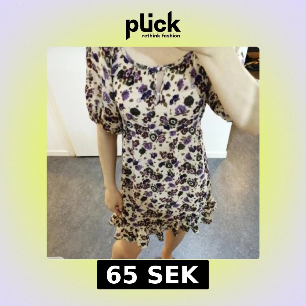 Söt kortklänning med beige botten och blommigt mönster i lila och mörkbrunt. Klänningen har puffiga kortärmar, rund hals med liten öppning och knyt, samt volangkant längst ner.