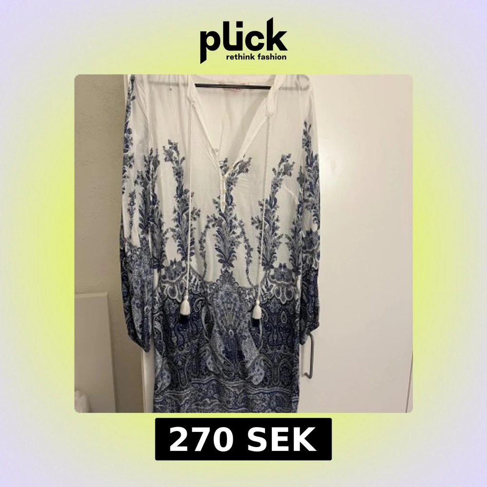 Säljer en vacker vit och blå klänning från Indiska med ett detaljerat blommönster. Klänningen har långa ärmar och knappar framtill. 💓Har sytt lite vid knapparna, små defekter men väldigt osynliga (bild 4)