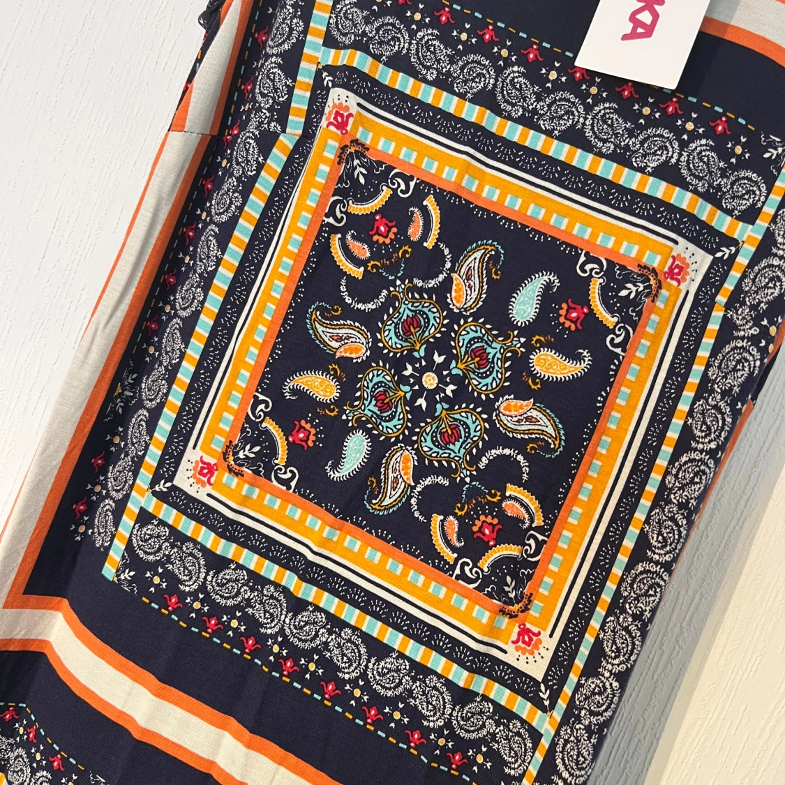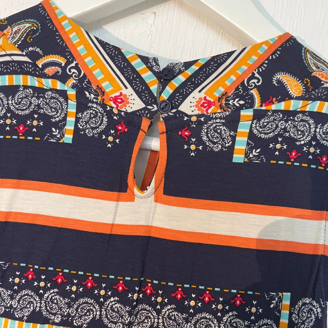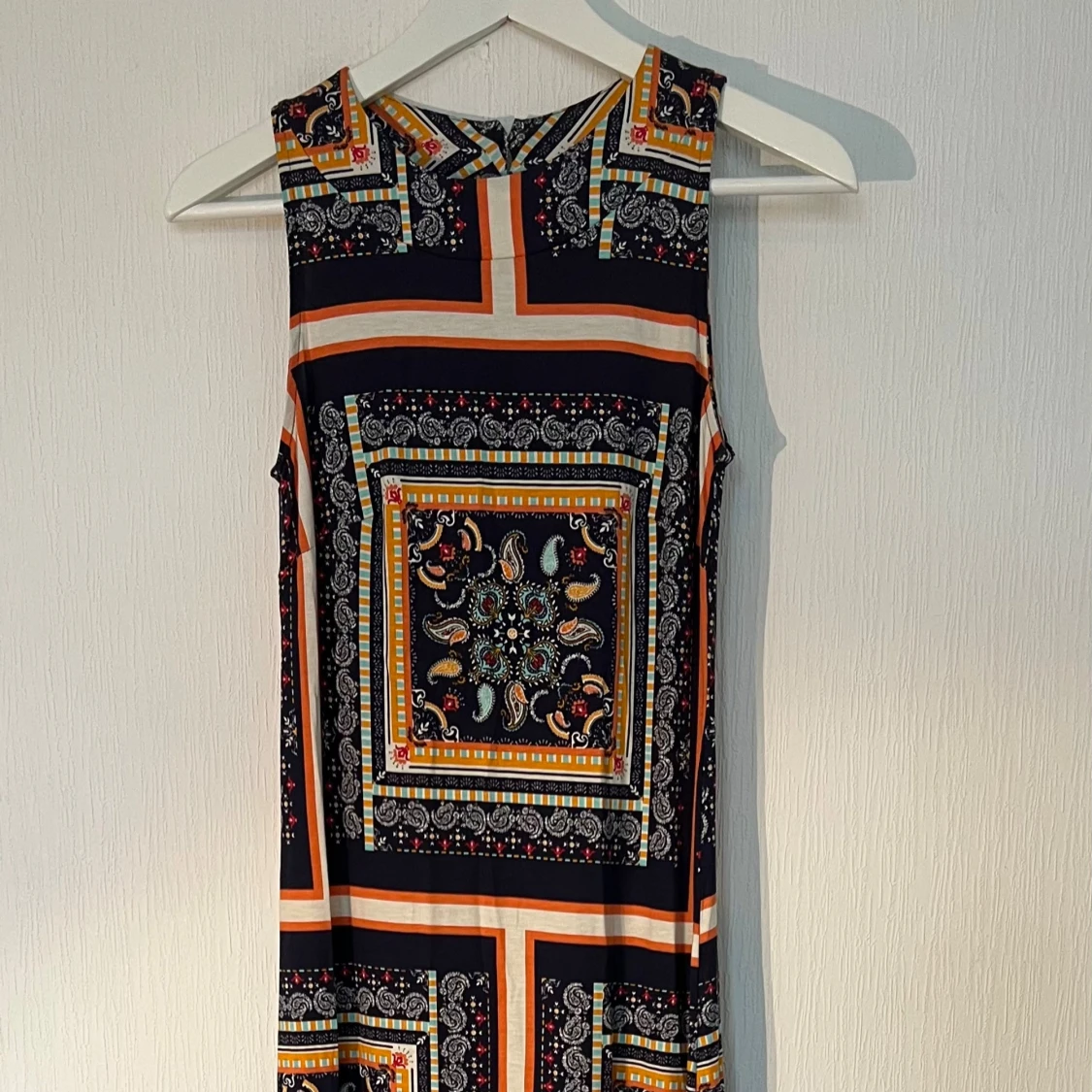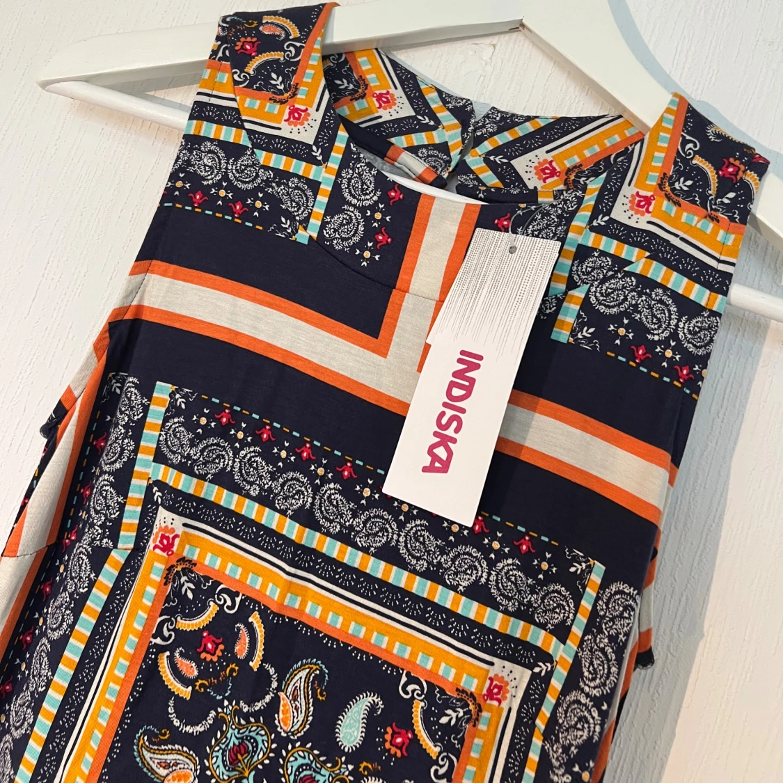Säljer en cool ärmlös klänning från Indiska i storlek XS. Klänningen har ett färgstarkt paisley- och rutmönster i marinblått, orange, vitt och inslag av turkos. Den är rak i modellen och har en lång längd, perfekt för att sticka ut med sin unika design. Ny med prislapp!