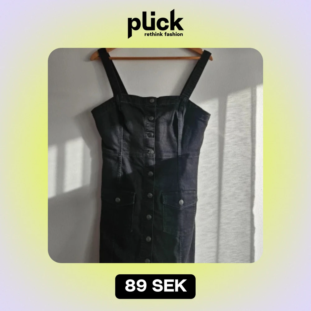 Säljer en svart jensklänning. Klänningen har breda axelband, en rak urringning och en stilren knappslå med knappar hela vägen ner.Perfek för både vardag och festliga tillfällen! Jag har bara använt den en gång.Hör av dig om du är intresserad!