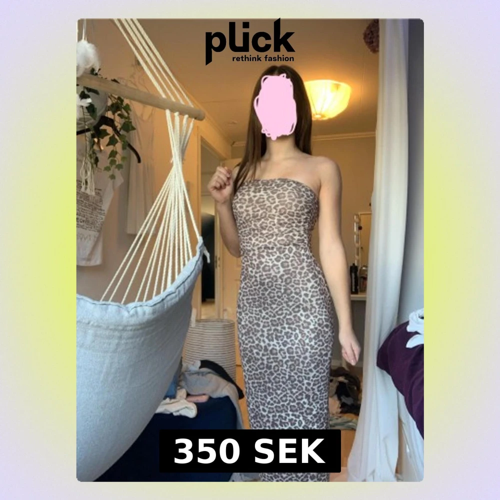 Säljer en snygg axelbandslös långklänning med leopardmönster. Klänningen är figurformad. Har inte använd någon hån och är i väldigt bra skick.
