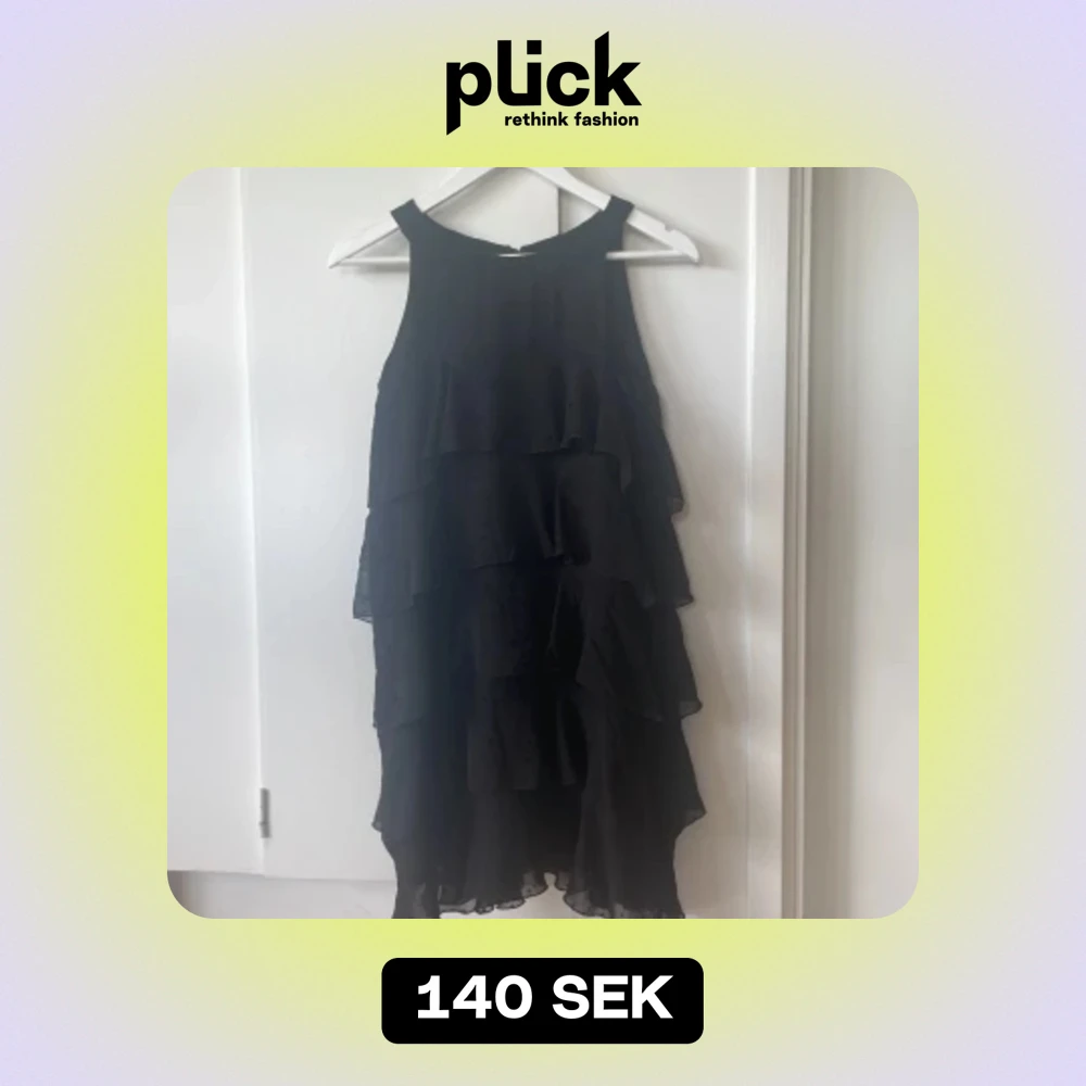 En svart volang klänning sorgår ner till knäna. Den har även detaljer av stjärnor. Använts vid två tillfällen.