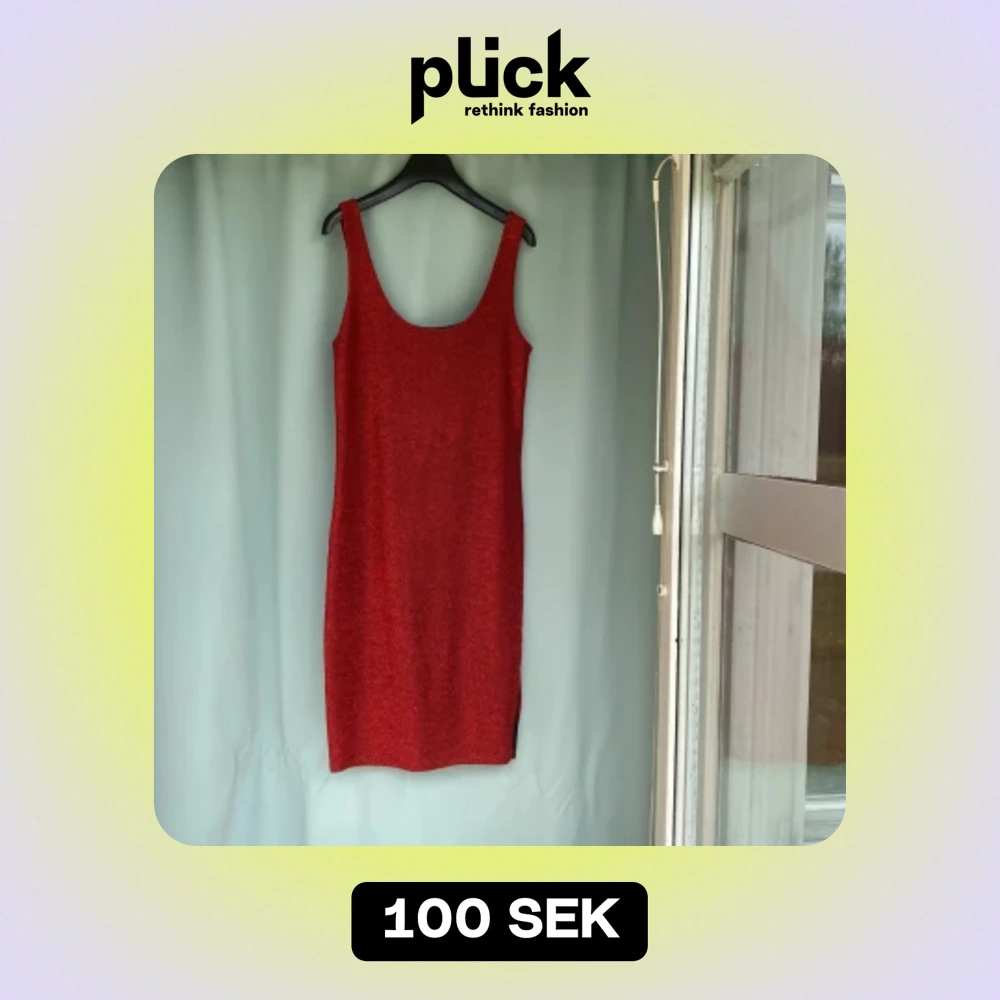 Röd ärmlös klänning i glitter tyg använd enstaka gång 58% Polyamid 22% Polyester 12% Metalic Fibres 8%Elastic