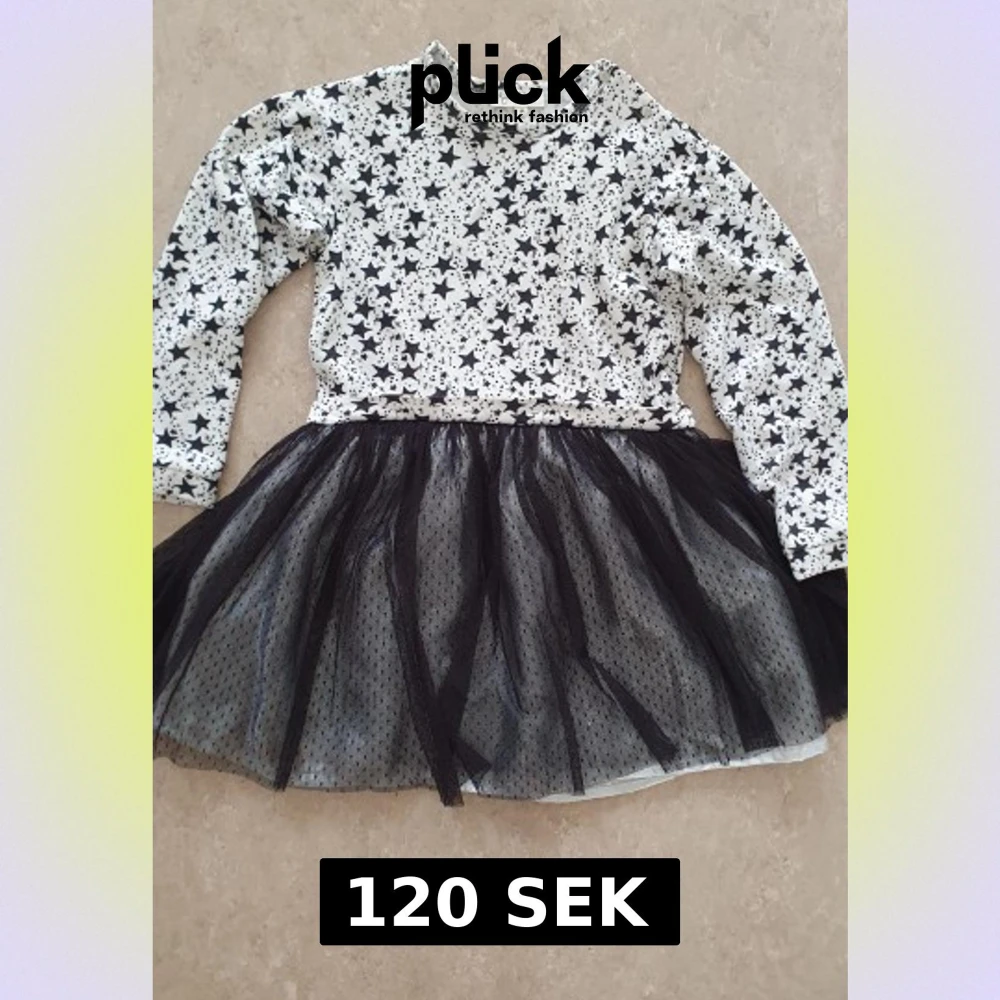 Supersöt klänning från Jessica Simpson med svartvit stjärnprint upptill och fluffig svart tyllkjol. Långärmad modell med tryckknappar vid axeln för enkel påklädning. Perfekt för dig som vill sticka ut lite extra! En fin klänning som passar till nyår.