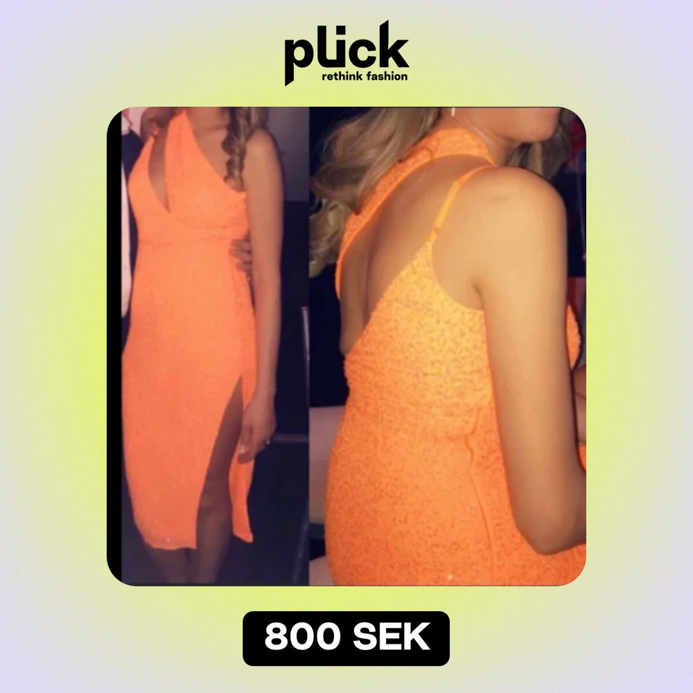 Säljer en nyandvänd klänning som går till knät. Den är orange och glittrig med fint material. Storlek 36. Pris kan diskuteras