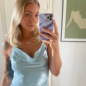 Jättefin ljusblå klänning i sodenmaterial. Öppen i ryggen, använd en gång på bröllop. Superfin och skön. Du står för frakt men kan mötas upp typ var som i Skåne 😊