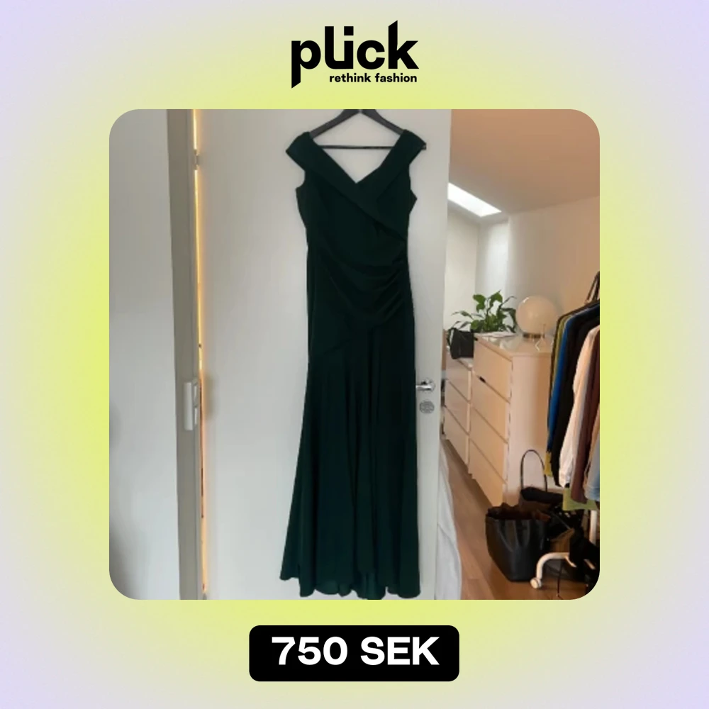 En mörkgrön balklänning med omlott som är från bubbleroom. Köptes förra året, använd en gång under balen.