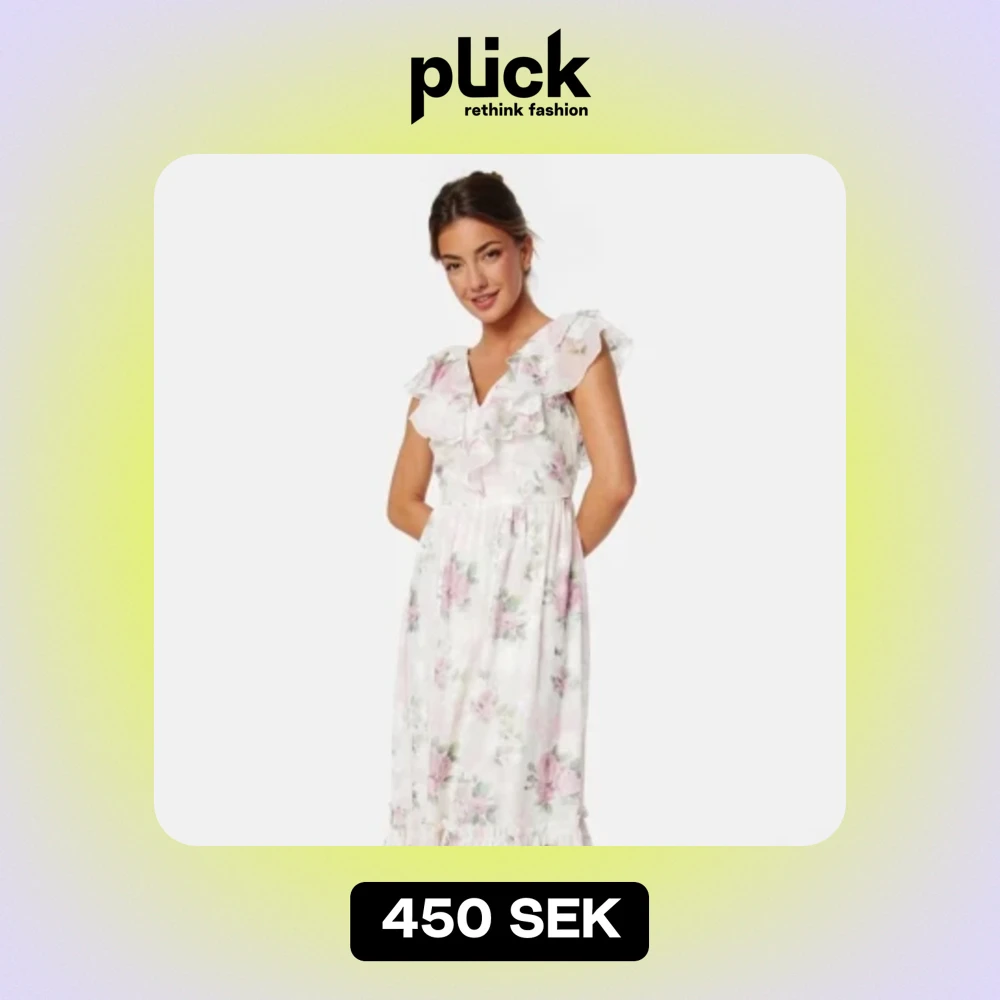 Jättefin ny volang klänning med blommigt mönster köpt på Bubbleroom! Prislappar kvar, säljes då jag råkat köpa i fel storlek! Nypris: 1200kr
