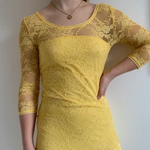 En fin gul sommarklänning i spets. Finns ingen storlek men passar bra på mig som är S och skulle säkert passa väldigt bra som XS. Jag är ca 1,56 och du kan se ungefär hur lång den är på mig. Tveka inte om att skicka till mig om du vill ha fler bilder på t.ex längd eller passform:) knappt använd