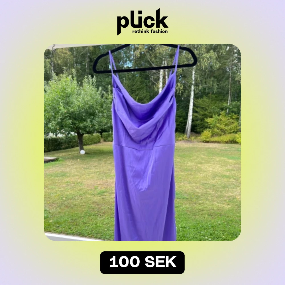 En lila klänning i satin. Säljer den pga att den aldrig blev använd 💜 Slits längs med vänster ben och dragkedja i ryggen. Passar bra till mig som har storlek S. Justerbara axelband 🥰🌷 (ALDRIG ANVÄND) Längd: 127 cm Midja: 73 cm Byst: 86 cm