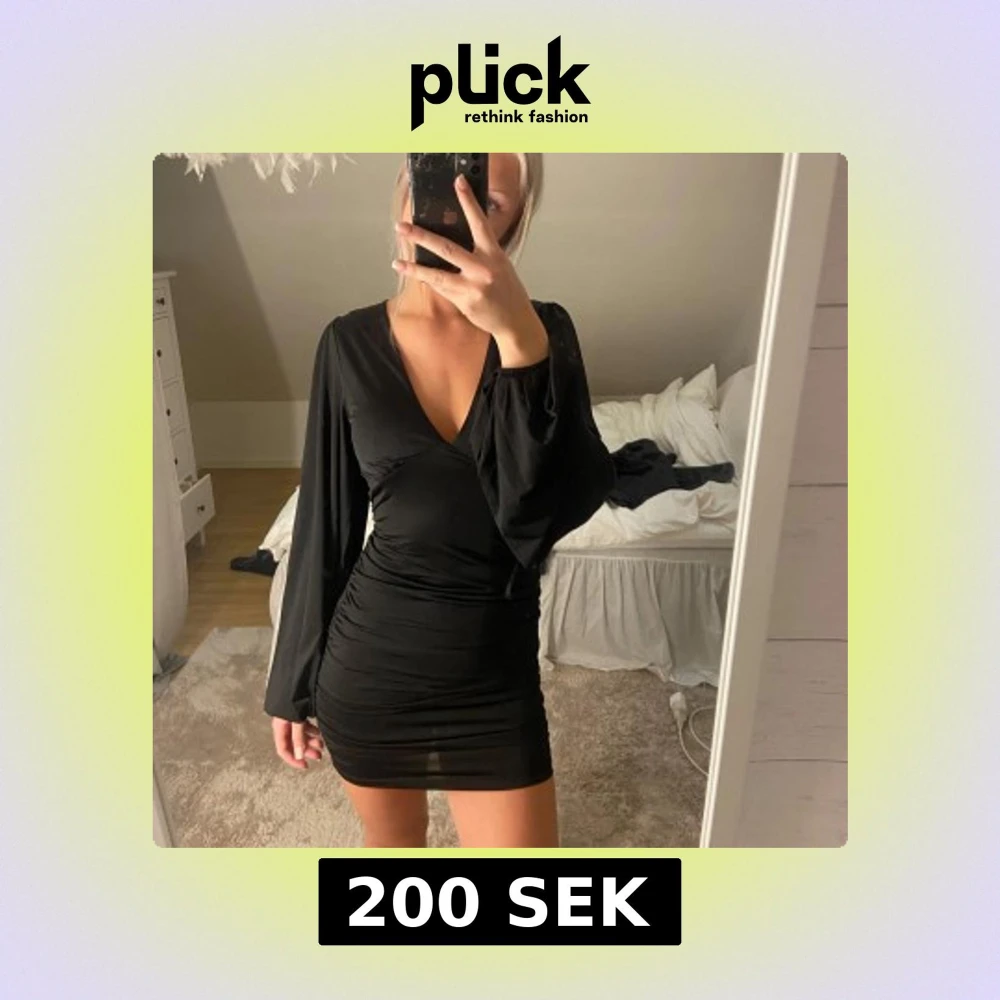 Säljer en svart kortklänning med djup v-ringning och långa, vida ärmar. Klänningen har en tight passform och är perfekt för dig som vill ha en stilren och elegant look.