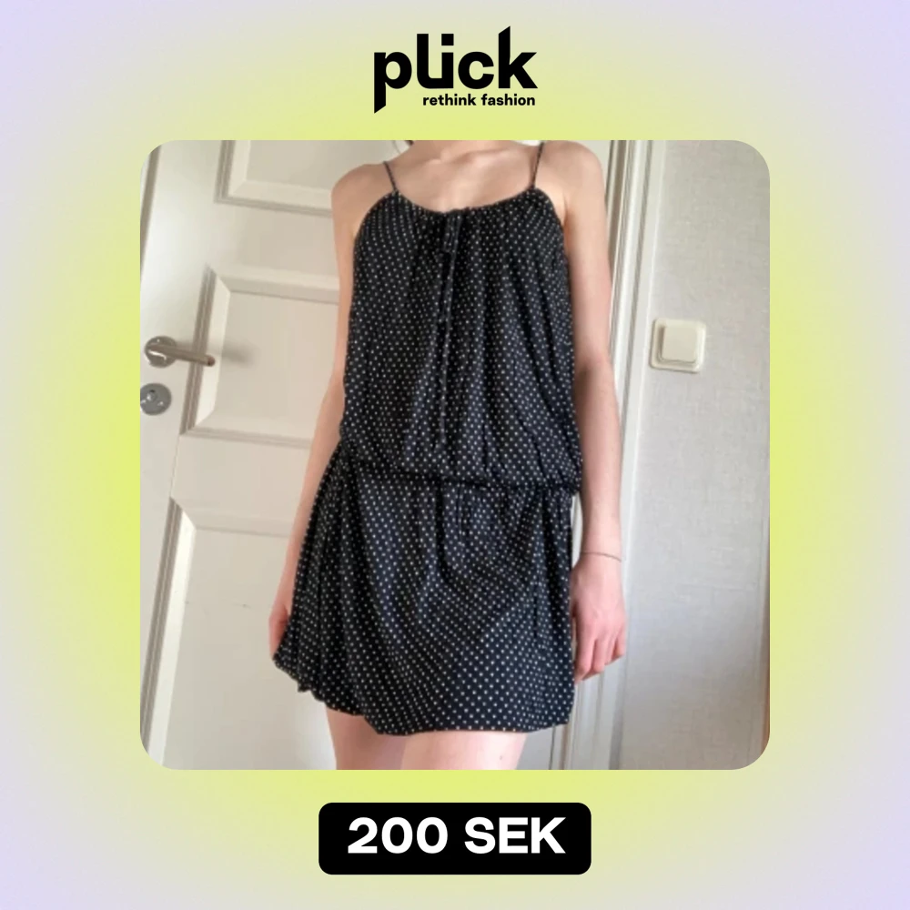 Jättefin svart klänning med vita prickar! Puffig vid kjol delen som formar kroppen så fint! Fina detaljer och snören längst fram som man knyter till en liten rosett 🎀. Skönt & stretchigt material och jättebra skick!🫶🏼
