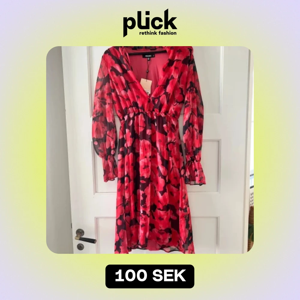 Säljer en superfin röd klänning från Missguided med ett blommigt mönster i svart och rött. Klänningen har långa ärmar och en v-ringad design med resor i midjan. Perfekt för festliga tillfällen! Prislapp kvar och aldrig använd.