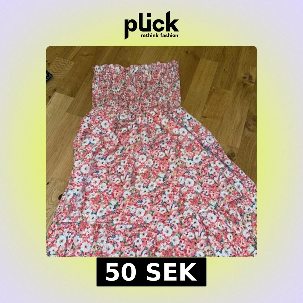 Säljer en söt axelbandslös klänning med ett färgglatt blommönster i rosa, vitt och grönt. Reså upptill och puffig och luftig nertill. Storlek S