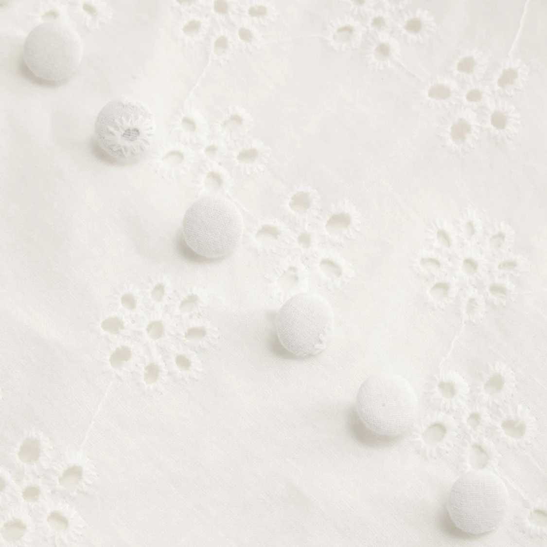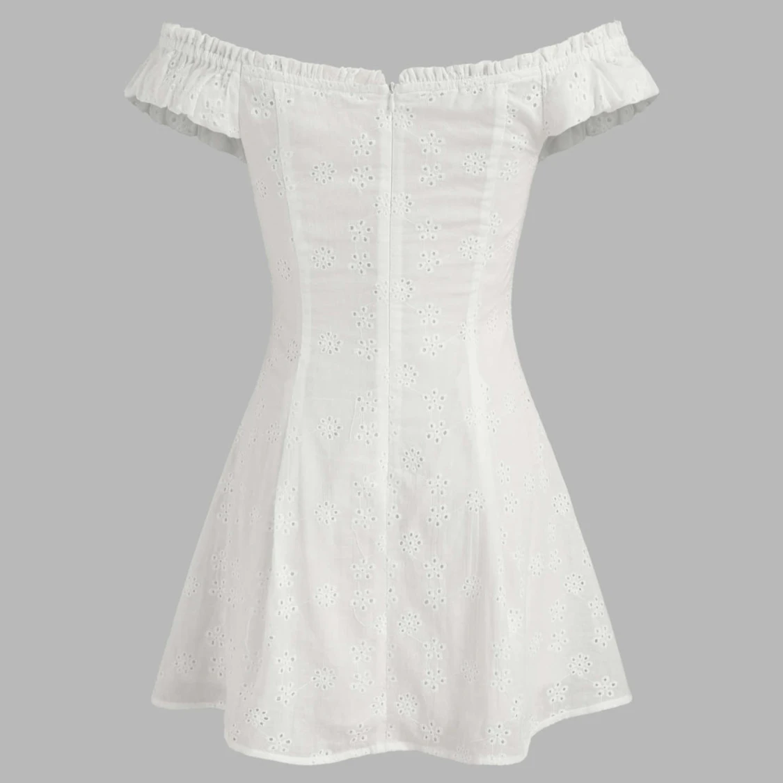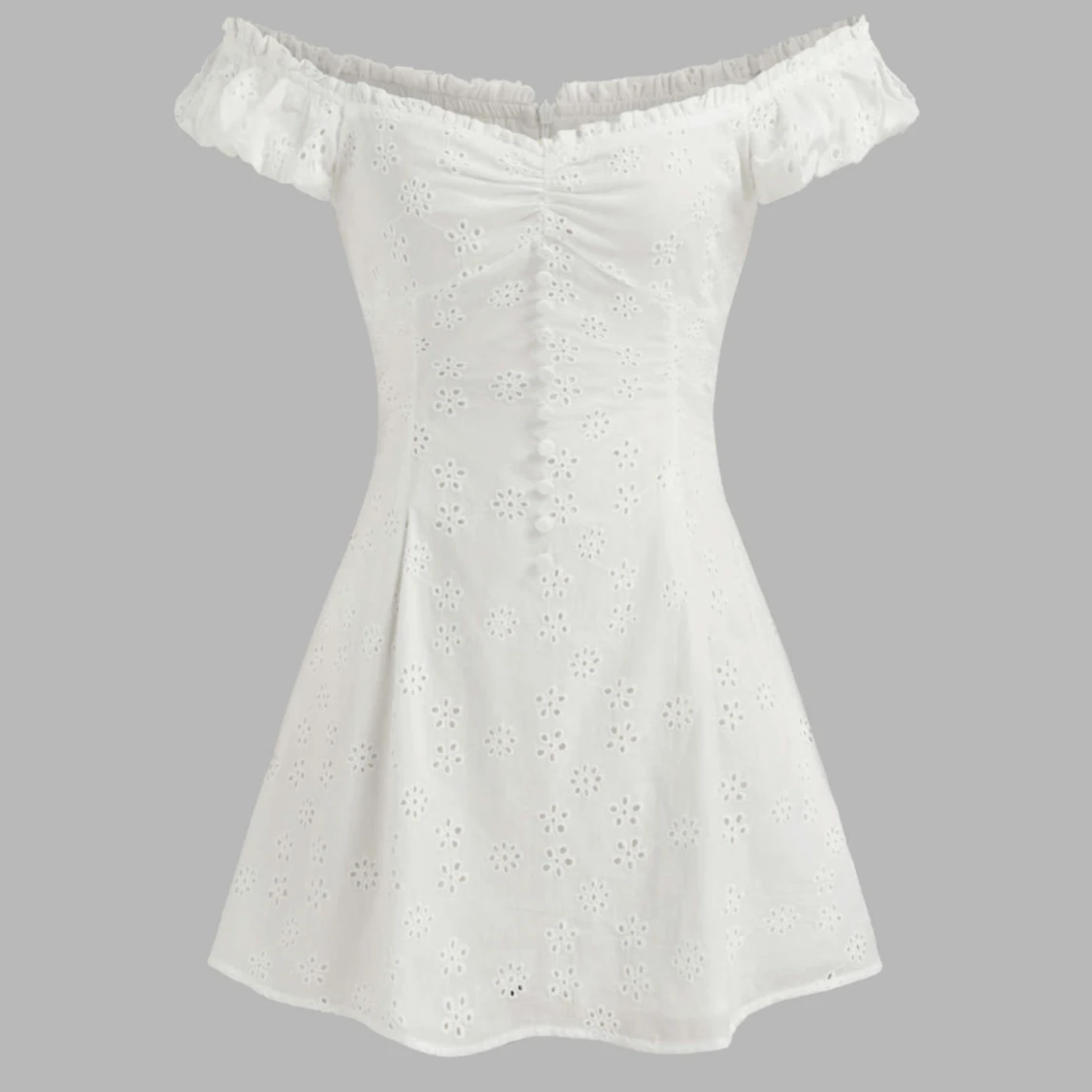 Superfin vit kortklänning med broderade blommor, volangdetaljer vid axlarna och knappar framtill. Perfekt klänning inför studenten eller midsommar.