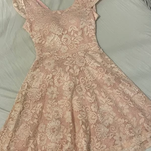 Rosa klänning i spets, en öppen rygg med kors. Vadderad byst. Köpt i Italien för några år sedan men endast använd 2-3 gånger. Som ny i skicket.