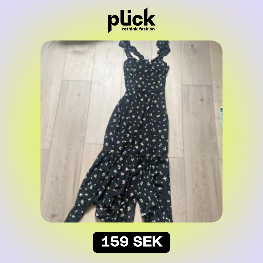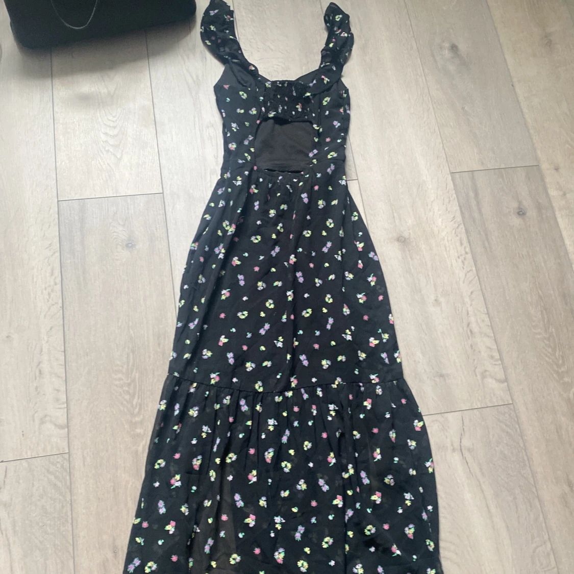 superfin blommig klänning från h&m i storlek XS. Använd 1-2 gånger på skolavslutning. Öppen bak. slits i benet.