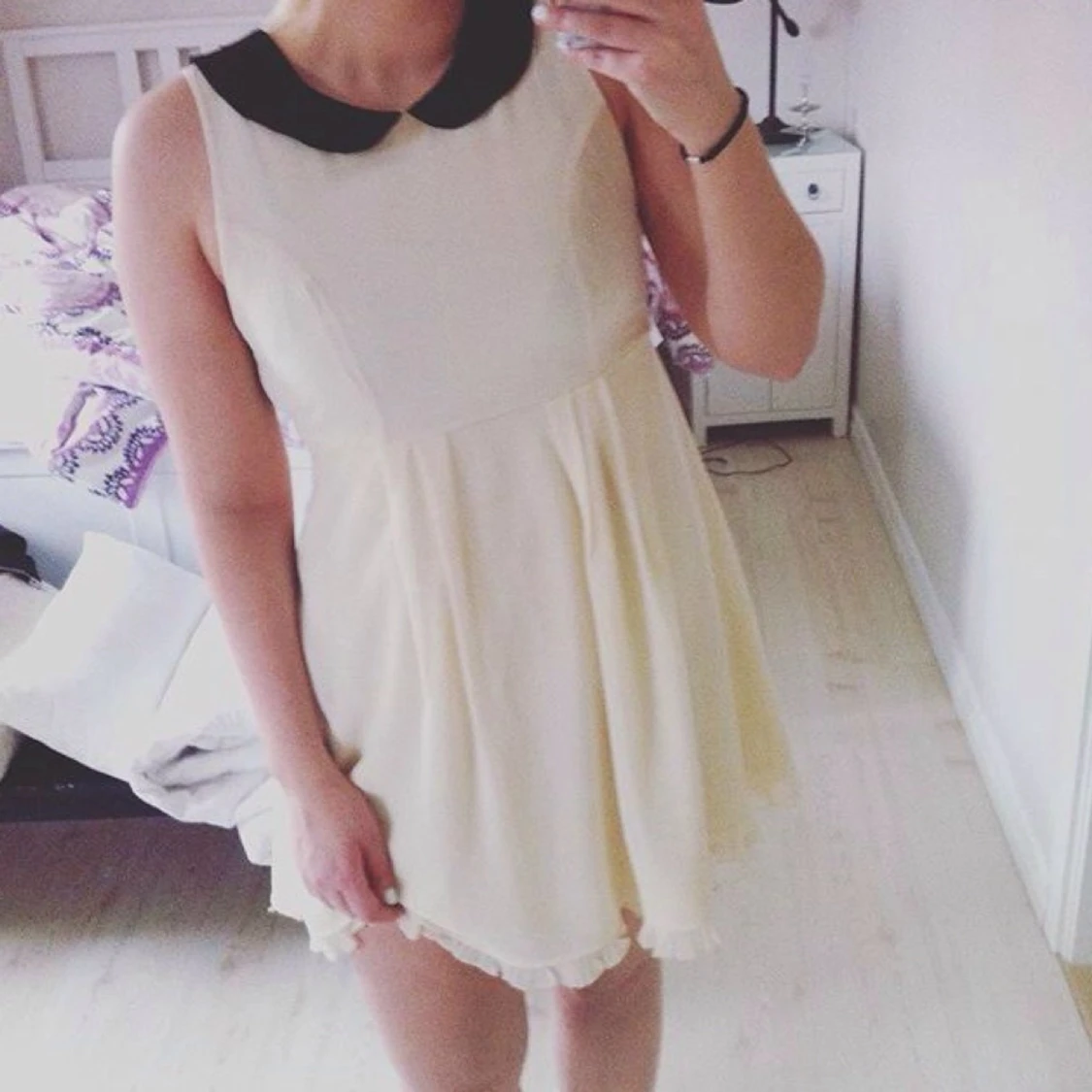 Beige klänning med svart krage som knäpps där bak. Endast använd en gång, så i väldigt bra skick. Köpt för 500kr, men säljer den för endast 120kr! Frakt tillkommer med 20kr och betalas av köpare.