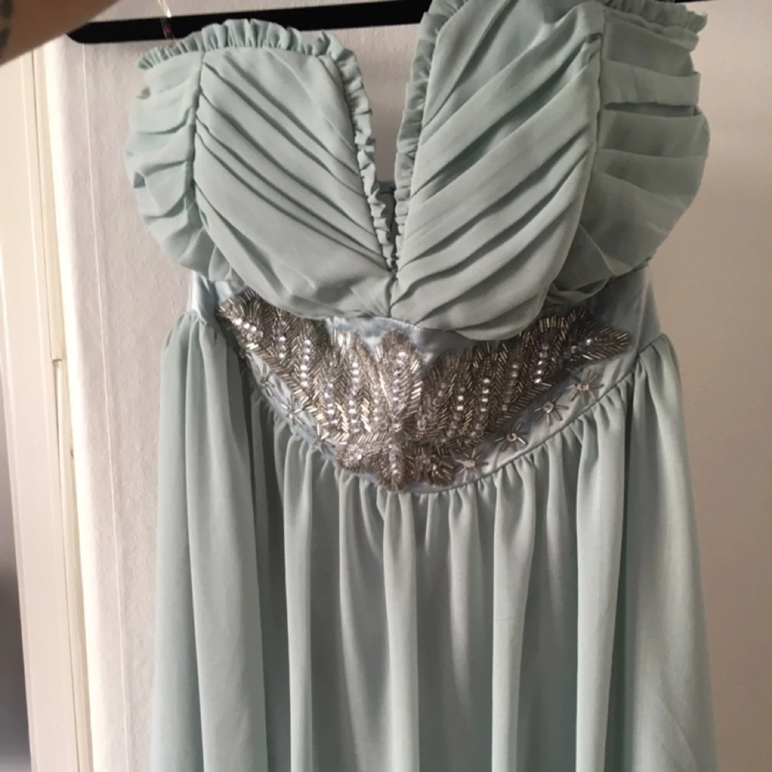 Ljusblå långklänning med spetsdetaljer  - Superfin ljusblå långklänning från JJ's House med tunna axelband, v-ringning och vackra spetsdetaljer. Kjolen är i flera lager tunn tyll. Snörning i ryggen för perfekt passform. Skriv till mig vid instresse om ni har några funderingar på mått osv.