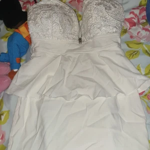 Vit axelbandslös kortklänning med rosett - Supersöt vit axelbandslös kortklänning med en stor rosett i ryggen. Endast använd en gång, så gott som ny🥰