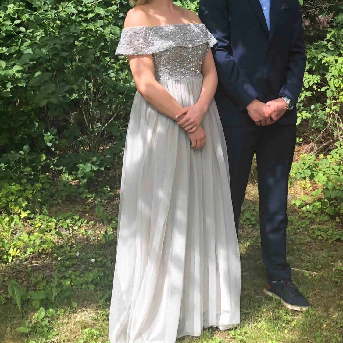 Säljer min fina balklänning till den som vill glittra lite extra på årets studentbal!! Klänningen är off-shoulder med tyllkjol, litet släp och paljettbeklädd topp. Passar dig som är mellan 150-165
