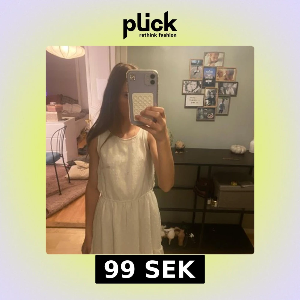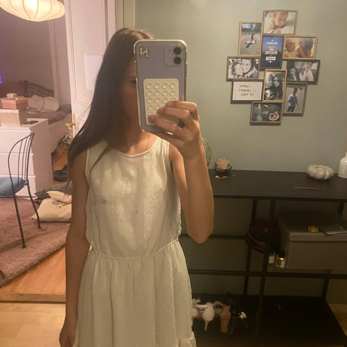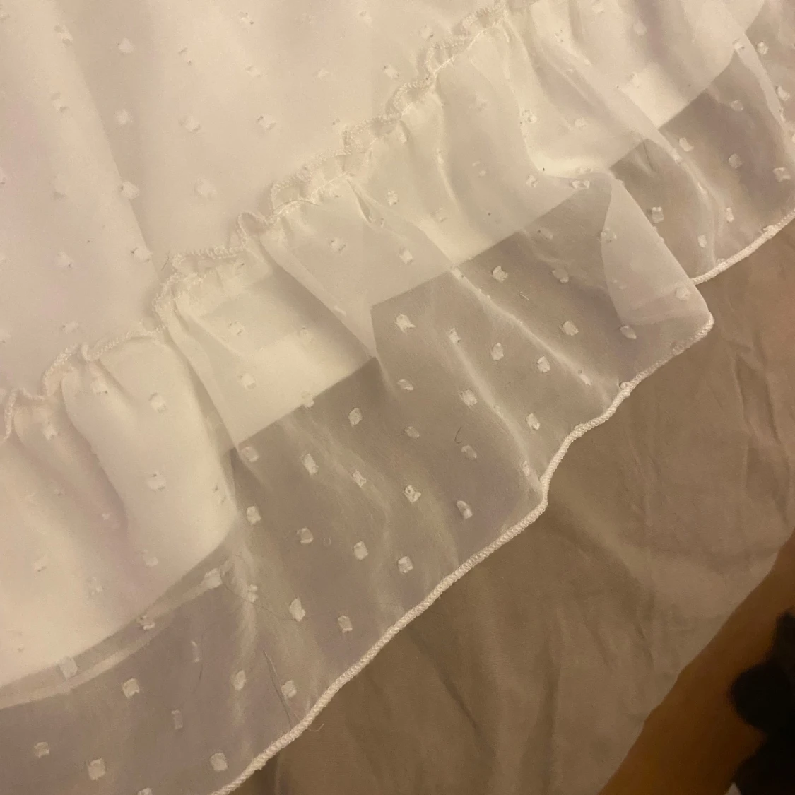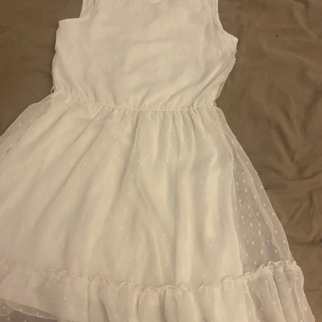 Superfin vit kortklänning med små prickar och volang nertill. Klänningen är ärmlös och har en lätt, luftig känsla med markerad midja. Perfekt för varma dagar och har ett skirt, romantiskt tyg som ger en söt vibe.
