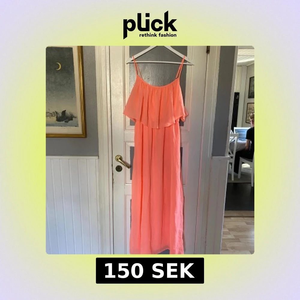 Säljer en vacker korallfärgad långklänning med volangdetaljer. Klänningen har smala axelband och en luftig passform, perfekt för sommarens festligheter. Den är tillverkad i ett lätt och bekvämt material som ger en härlig känsla.