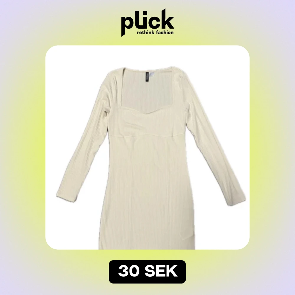 Kort ribbad klänning från H&M. Ljusbeige, nästan vit. Använd 1 gång men samman har lossat lite vid bysten, syns på sista bilden.