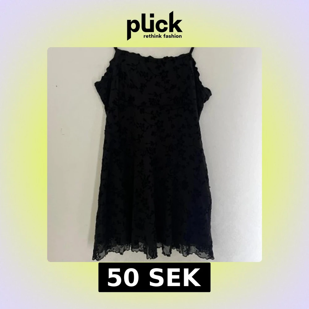 Säljer en svart klänning med tunna axelband och blommigt mönster. Klänningen har en lätt genomskinlig mesh med blommor och ett tunt svart tyg under. 💕