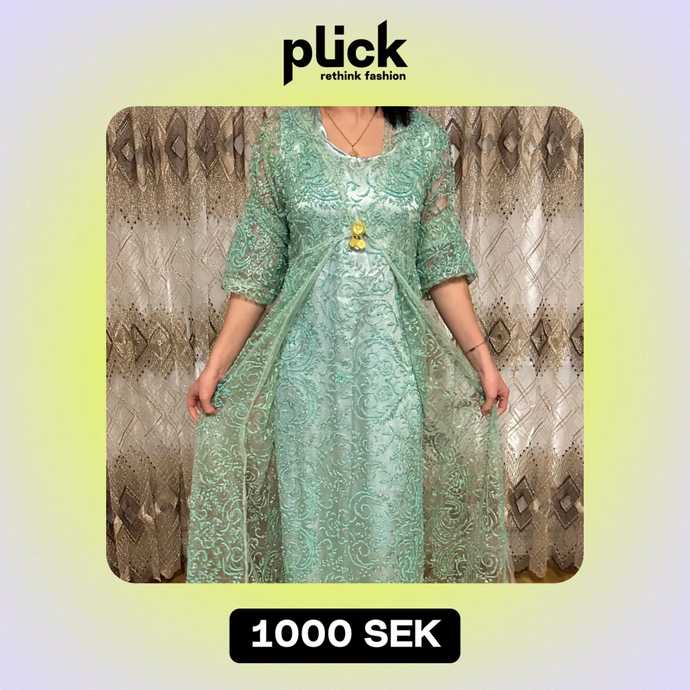 Säljer en elegant mintgrön långklänning i spets med vackra broderade detaljer. Klänningen har trekvartsärmar och en fin knytning i midjan. Perfekt för festliga tillfällen med sin unika design och skira material.